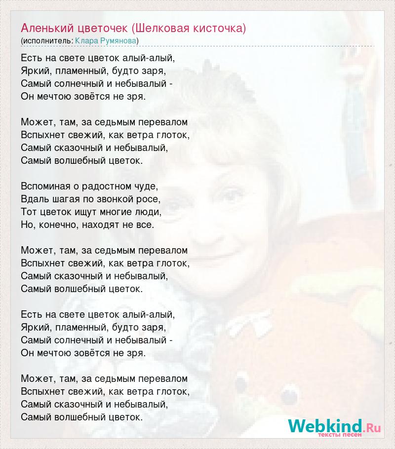 Есть на свете цветок алый-алый, Яркий, пламенный, будто заря, Самый солнечный и небывалый - Он мечтою зовётся не зря. Может, там, за седьмым перевалом Вспыхнет свежий, как ветра глоток, Самый сказочный и небывалый, Самый волшебный цветок. Вспоминая о радостном чуде, Вдаль шагая по звонкой росе, Тот цветок ищут многие люди, Но, конечно, находят не все. Может, там, за седьмым перевалом Вспыхнет свежий, как ветра глоток, Самый сказочный и небывалый, Самый волшебный цветок. Есть на свете цветок алый-алый, Яркий, пламенный, будто заря, Самый солнечный и небывалый - Он мечтою зовётся не зря. Может, там, за седьмым перевалом Вспыхнет свежий, как ветра глоток, Самый сказочный и небывалый, Самый волшебный цветок.