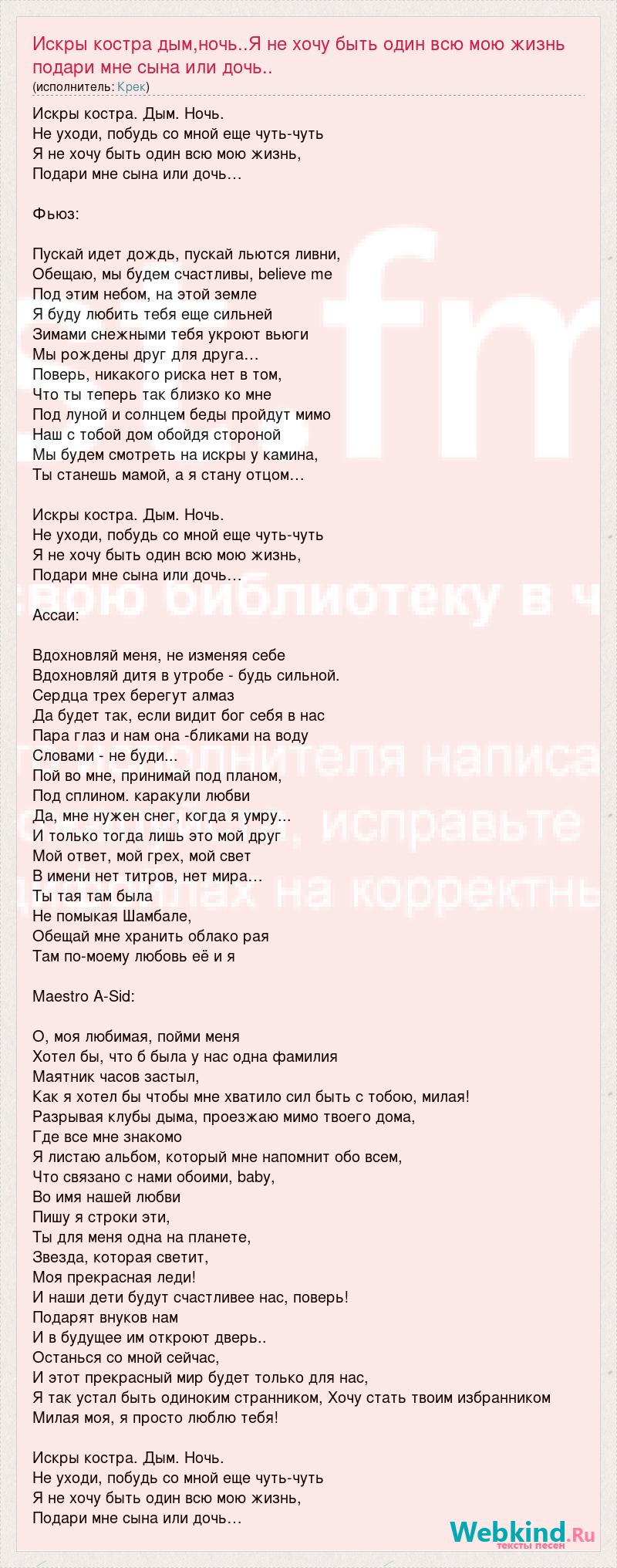 Искры костра. Дым. Ночь. Не уходи, побудь со мной еще чуть-чуть Я не хочу быть один всю мою жизнь, Подари мне сына или дочь… Фьюз: Пускай идет дождь, пускай льются ливни, Обещаю, мы будем счастливы, believe me Под этим небом, на этой земле Я буду любить тебя еще сильней Зимами снежными тебя укроют вьюги Мы рождены друг для друга… Поверь, никакого риска нет в том, Что ты теперь так близко ко мне Под луной и солнцем беды пройдут мимо Наш с тобой дом обойдя стороной Мы будем смотреть на искры у камина, Ты станешь мамой, а я стану отцом… Искры костра. Дым. Ночь. Не уходи, побудь со мной еще чуть-чуть Я не хочу быть один всю мою жизнь, Подари мне сына или дочь… Ассаи: Вдохновляй меня, не изменяя себе Вдохновляй дитя в утробе - будь сильной. Сердца трех берегут алмаз Да будет так, если видит бог себя в нас Пара глаз и нам она -бликами на воду Словами - не буди... Пой во мне, принимай под планом, Под сплином. каракули любви Да, мне нужен снег, когда я умру... И только тогда лишь это мой друг Мой ответ, мой грех, мой свет В имени нет титров, нет мира… Ты тая там была Не помыкая Шамбале, Обещай мне хранить облако рая Там по-моему любовь её и я Maestro A-Sid: О, моя любимая, пойми меня Хотел бы, что б была у нас одна фамилия Маятник часов застыл, Как я хотел бы чтобы мне хватило сил быть с тобою, милая! Разрывая клубы дыма, проезжаю мимо твоего дома, Где все мне знакомо Я листаю альбом, который мне напомнит обо всем, Что связано с нами обоими, baby, Во имя нашей любви Пишу я строки эти, Ты для меня одна на планете, Звезда, которая светит, Моя прекрасная леди! И наши дети будут счастливее нас, поверь! Подарят внуков нам И в будущее им откроют дверь.. Останься со мной сейчас, И этот прекрасный мир будет только для нас, Я так устал быть одиноким странником, Хочу стать твоим избранником Милая моя, я просто люблю тебя! Искры костра. Дым. Ночь. Не уходи, побудь со мной еще чуть-чуть Я не хочу быть один всю мою жизнь, Подари мне сына или дочь…