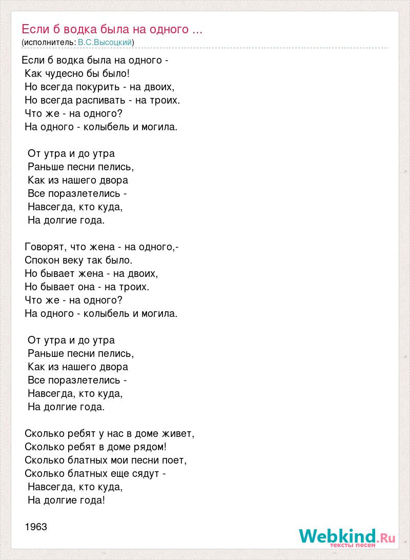 Если б водка была на одного - Как чудесно бы было! Но всегда покурить - на двоих, Но всегда распивать - на троих. Что же - на одного? На одного - колыбель и могила. От утра и до утра Раньше песни пелись, Как из нашего двора Все поразлетелись - Навсегда, кто куда, На долгие года. Говорят, что жена - на одного,- Спокон веку так было. Но бывает жена - на двоих, Но бывает она - на троих. Что же - на одного? На одного - колыбель и могила. От утра и до утра Раньше песни пелись, Как из нашего двора Все поразлетелись - Навсегда, кто куда, На долгие года. Сколько ребят у нас в доме живет, Сколько ребят в доме рядом! Сколько блатных мои песни поет, Сколько блатных еще сядут - Навсегда, кто куда, На долгие года! 1963