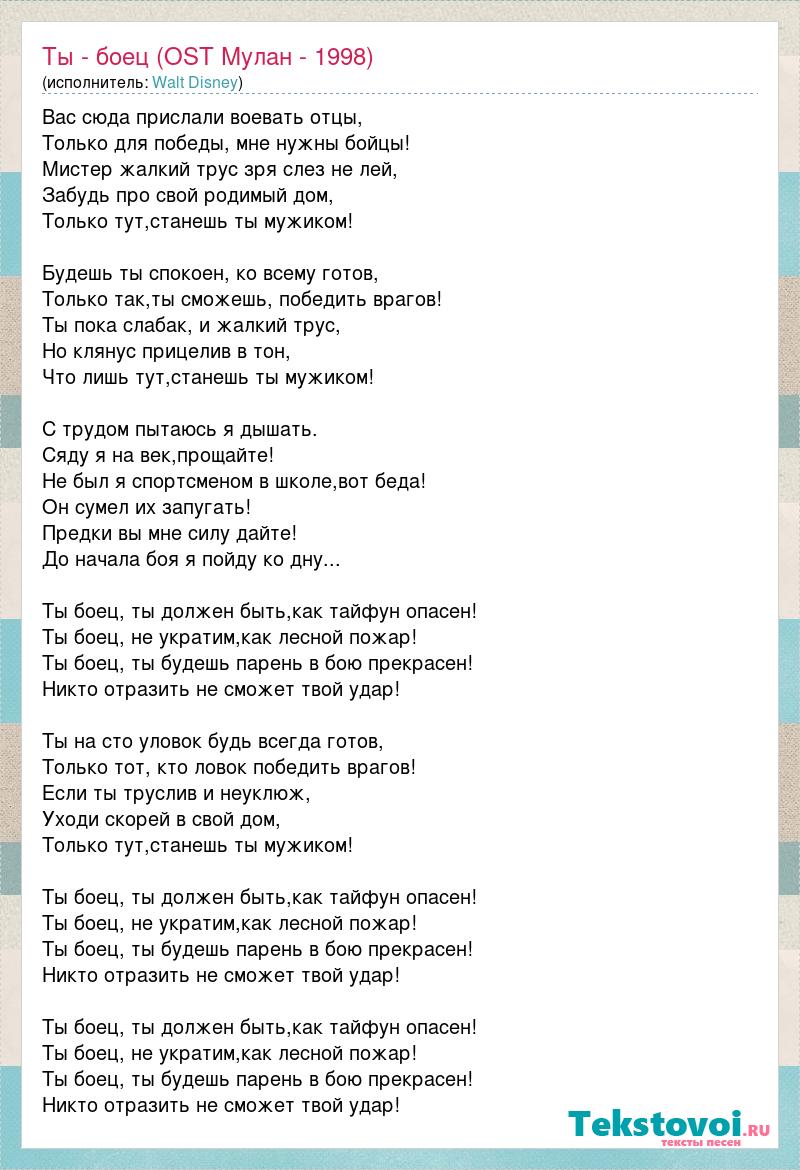Вас сюда прислали воевать отцы, Только для победы, мне нужны бойцы! Мистер жалкий трус зря слез не лей, Забудь про свой родимый дом, Только тут,станешь ты мужиком! Будешь ты спокоен, ко всему готов, Только так,ты сможешь, победить врагов! Ты пока слабак, и жалкий трус, Но клянус прицелив в тон, Что лишь тут,станешь ты мужиком! С трудом пытаюсь я дышать. Сяду я на век,прощайте! Не был я спортсменом в школе,вот беда! Он сумел их запугать! Предки вы мне силу дайте! До начала боя я пойду ко дну... Ты боец, ты должен быть,как тайфун опасен! Ты боец, не укратим,как лесной пожар! Ты боец, ты будешь парень в бою прекрасен! Никто отразить не сможет твой удар! Ты на сто уловок будь всегда готов, Только тот, кто ловок победить врагов! Если ты труслив и неуклюж, Уходи скорей в свой дом, Только тут,станешь ты мужиком! Ты боец, ты должен быть,как тайфун опасен! Ты боец, не укратим,как лесной пожар! Ты боец, ты будешь парень в бою прекрасен! Никто отразить не сможет твой удар! Ты боец, ты должен быть,как тайфун опасен! Ты боец, не укратим,как лесной пожар! Ты боец, ты будешь парень в бою прекрасен! Никто отразить не сможет твой удар!