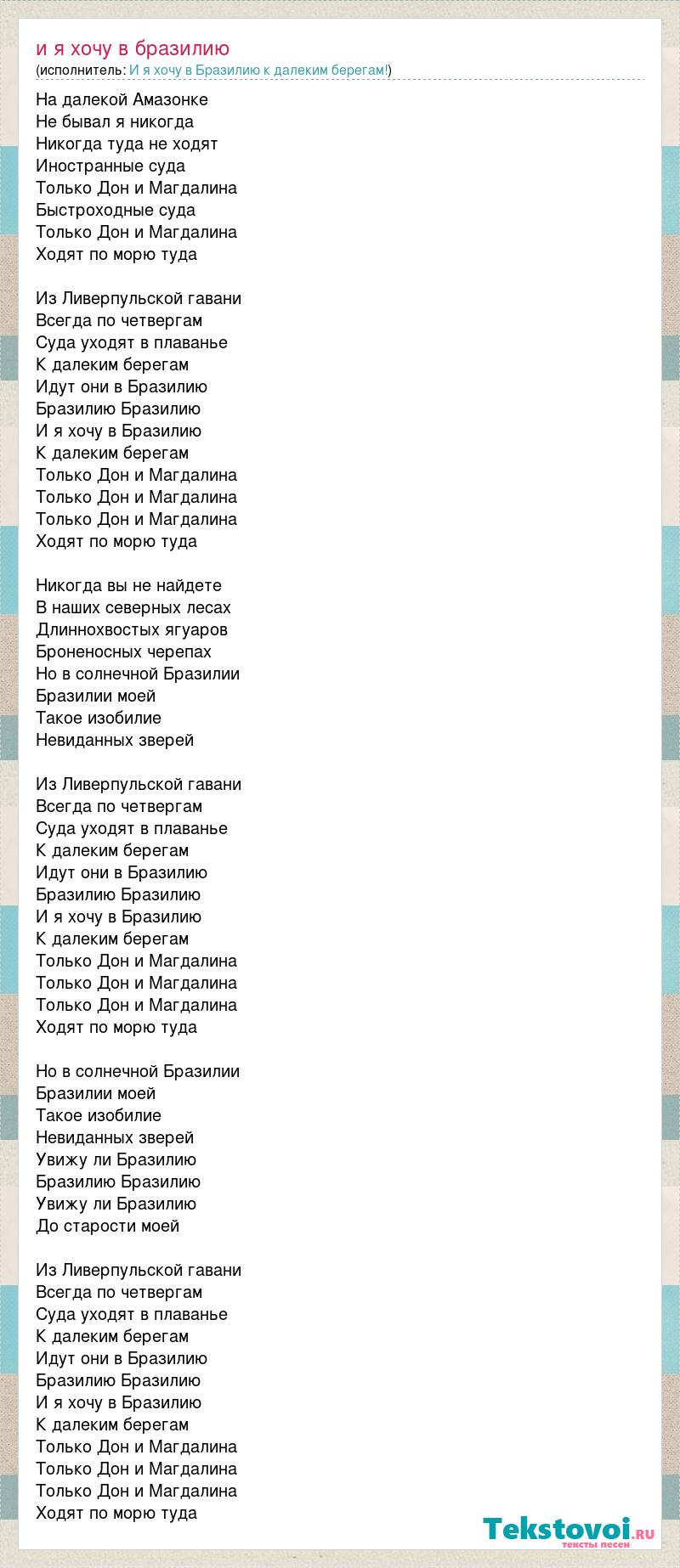 На далекой Амазонке Не бывал я никогда Никогда туда не ходят Иностранные суда Только Дон и Магдалина Быстроходные суда Только Дон и Магдалина Ходят по морю туда Из Ливерпульской гавани Всегда по четвергам Суда уходят в плаванье К далеким берегам Идут они в Бразилию Бразилию Бразилию И я хочу в Бразилию К далеким берегам Только Дон и Магдалина Только Дон и Магдалина Только Дон и Магдалина Ходят по морю туда Никогда вы не найдете В наших северных лесах Длиннохвостых ягуаров Броненосных черепах Но в солнечной Бразилии Бразилии моей Такое изобилие Невиданных зверей Из Ливерпульской гавани Всегда по четвергам Суда уходят в плаванье К далеким берегам Идут они в Бразилию Бразилию Бразилию И я хочу в Бразилию К далеким берегам Только Дон и Магдалина Только Дон и Магдалина Только Дон и Магдалина Ходят по морю туда Но в солнечной Бразилии Бразилии моей Такое изобилие Невиданных зверей Увижу ли Бразилию Бразилию Бразилию Увижу ли Бразилию До старости моей Из Ливерпульской гавани Всегда по четвергам Суда уходят в плаванье К далеким берегам Идут они в Бразилию Бразилию Бразилию И я хочу в Бразилию К далеким берегам Только Дон и Магдалина Только Дон и Магдалина Только Дон и Магдалина Ходят по морю туда
