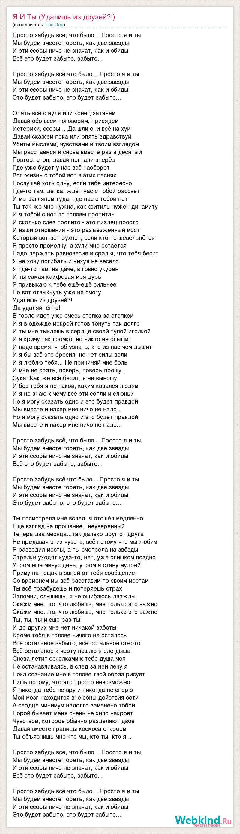 Просто забудь всё, что было... Просто я и ты Мы будем вместе гореть, как две звезды И эти ссоры ничо не значат, как и обиды Всё это будет забыто, забыто... Просто забудь всё что было... Просто я и ты Мы будем вместе гореть, как две звезды И эти ссоры ничо не значат, как и обиды Это будет забыто, это будет забыто... Опять всё с нуля или конец затянем Давай обо всем поговорим, присядем Истерики, ссоры... Да шли они всё на хуй Давай скажем пока или опять здравствуй Убиты мыслями, чувствами и твоим взглядом Мы расстаёмся и снова вместе раз в десятый Повтор, стоп, давай погнали вперёд Где уже будет у нас всё наоборот Вся жизнь с тобой вот в этих песнях Послушай хоть одну, если тебе интересно Где-то там, детка, ждёт нас с тобой рассвет И мы заглянем туда, где нас с тобой нет Ты так же мне нужна, как фитиль нужен динамиту И я тобой с ног до головы пропитан И сколько слёз пролито - это пиздец просто И наши отношения - это разъезженный мост Который вот-вот рухнет, если кто-то шевельнётся Я просто промолчу, а хули мне остается Надо держать равновесие и срал я, что тебя бесит Я не хочу погибать и нихуя не весело Я где-то там, на даче, в говно укурен И ты самая кайфовая моя дурь Я привыкаю к тебе ещё-ещё сильнее Но вот отвыкнуть уже не смогу Удалишь из друзей?! Да удаляй, ёптэ! В горло идет уже смесь стопка за стопкой И я в одежде мокрой готов тонуть так долго И ты мне тыкаешь в сердце своей тупой иголкой И я кричу так громко, но никто не слышит И надо время, чтоб узнать, кто из нас чем дышит И я бы всё это бросил, но нет силы воли И я люблю тебя... Не причиняй мне боль И мне не срать, поверь, поверь прошу... Сука! Как же всё бесит, я не выношу И без тебя я не такой, каким казался людям И я не знаю к чему все эти сопли и слюньи Но я могу сказать одно и это будет правдой Мы вместе и нахер мне ничо не надо... Но я могу сказать одно и это будет правдой Мы вместе и нахер мне ничо не надо... Просто забудь всё, что было... Просто я и ты Мы будем вместе гореть, как две звезды И эти ссоры ничо не значат, как и обиды Всё это будет забыто, забыто... Просто забудь всё что было... Просто я и ты Мы будем вместе гореть, как две звезды И эти ссоры ничо не значат, как и обиды Это будет забыто, это будет забыто... Ты посмотрела мне вслед, я отошёл медленно Ещё взгляд на прощание...неуверенный Теперь два месяца...так далеко друг от друга Не предавая этих чувств, всё потому что мы любим Я разводил мосты, а ты смотрела на звёзды Стрелки уходят куда-то, нет, уже слишком поздно Утром еще минус день, утром я стану мудрей Приму на тощак в запой от тебя сообщение Со временем мы всё расставим по своим местам Ты всё позабудешь и потеряешь страх Запомни, слышишь, я не ошибаюсь дважды Скажи мне...то, что любишь, мне только это важно Скажи мне...то, что любишь, мне только это важно Ты, ты, ты и еще раз ты И до других мне нет никакой заботы Кроме тебя в голове ничего не осталось Всё остальное забыто, всё остальное стёрто Всё остальное к черту пошлю я еле дыша Снова летит осколками к тебе душа моя Не останавливаясь, в след за ней лечу я Пока сознание мне в голове твой образ рисует Лишь потому, что это просто невозможно Я никогда тебе не вру и никогда не спорю Мой мозг находится вне зоны действия сети А сердце минимум надолго заменено тобой Порой бывает меня очень не хило накроет Чувством, которое обычно разделяют двое Давай вместе границы космоса откроем 
