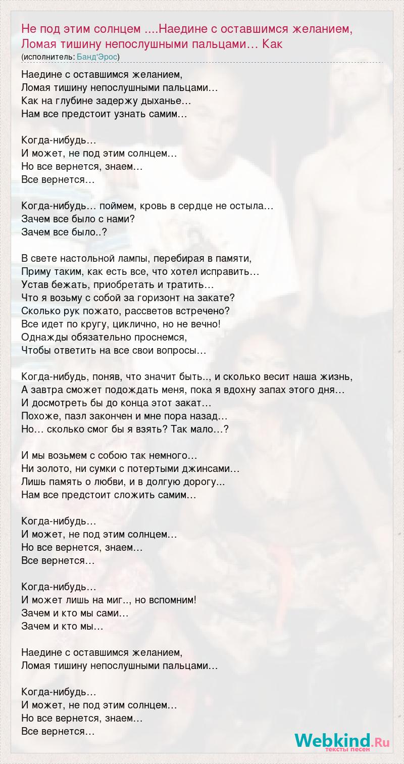 Наедине с оставшимся желанием, Ломая тишину непослушными пальцами… Как на глубине задержу дыханье… Нам все предстоит узнать самим… Когда-нибудь… И может, не под этим солнцем… Но все вернется, знаем… Все вернется… Когда-нибудь… поймем, кровь в сердце не остыла… Зачем все было с нами? Зачем все было..? В свете настольной лампы, перебирая в памяти, Приму таким, как есть все, что хотел исправить… Устав бежать, приобретать и тратить… Что я возьму с собой за горизонт на закате? Сколько рук пожато, рассветов встречено? Все идет по кругу, циклично, но не вечно! Однажды обязательно проснемся, Чтобы ответить на все свои вопросы… Когда-нибудь, поняв, что значит быть.., и сколько весит наша жизнь, А завтра сможет подождать меня, пока я вдохну запах этого дня… И досмотреть бы до конца этот закат… Похоже, пазл закончен и мне пора назад… Но… сколько смог бы я взять? Так мало…? И мы возьмем с собою так немного… Ни золото, ни сумки с потертыми джинсами… Лишь память о любви, и в долгую дорогу... Нам все предстоит сложить самим… Когда-нибудь… И может, не под этим солнцем… Но все вернется, знаем… Все вернется… Когда-нибудь… И может лишь на миг.., но вспомним! Зачем и кто мы сами… Зачем и кто мы… Наедине с оставшимся желанием, Ломая тишину непослушными пальцами… Когда-нибудь… И может, не под этим солнцем… Но все вернется, знаем… Все вернется…