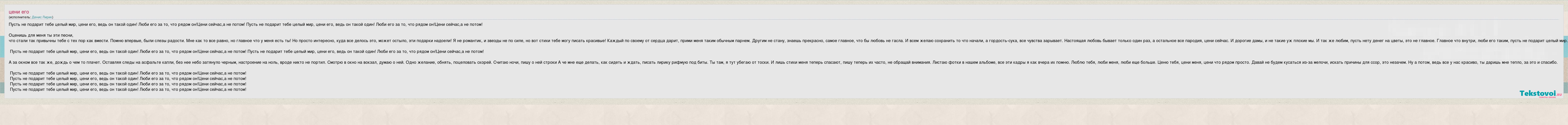 Пусть не подарит тебе целый мир, цени его, ведь он такой один! Люби его за то, что рядом он!Цени сейчас,а не потом! Пусть не подарит тебе целый мир, цени его, ведь он такой один! Люби его за то, что рядом он!Цени сейчас,а не потом! Оценишь для меня ты эти песни, что стали так привычны тебе с тех пор как вмести. Помню впервые, были слезы радости. Мне как то все равно, но главное что у меня есть ты! Но просто интересно, куда все делось это, может остыло, эти подарки надоели! Я не романтик, и звезды не по силе, но вот стихи тебе могу писать красивые! Каждый по своему от сердца дарит, прими меня таким обычным парнем. Другим не стану, знаешь прекрасно, самое главное, что бы любовь не гасла. И всем желаю сохранить то что начали, а гордость-сука, все чувства зарывает. Настоящая любовь бывает только один раз, а остальное все пародия, цени сейчас. И дорогие дамы, и не такие уж плохие мы. И так же любим, пусть нету денег на цветы, это не главное. Главное что внутри, люби его таким, пусть не подарит целый мир. Пусть не подарит тебе целый мир, цени его, ведь он такой один! Люби его за то, что рядом он!Цени сейчас,а не потом! Пусть не подарит тебе целый мир, цени его, ведь он такой один! Люби его за то, что рядом он!Цени сейчас,а не потом! А за окном все так же, дождь о чем то плачет. Оставляя следы на асфальте капли, без нее небо затянуло черным, настроение на ноль, вроде никто не портил. Смотрю в окно на вокзал, думаю о ней. Одно желание, обнять, поцеловать скорей. Считаю ночи, пишу о ней строки А че мне еще делать, как сидеть и ждать, писать лирику рифмую под биты. Ты там, я тут убегаю от тоски. И лишь стихи меня теперь спасают, пишу теперь их часто, не обращай внимания. Листаю фотки в нашем альбоме, все эти кадры я как вчера их помню. Люблю тебя, люби меня, люби еще больше. Ценю тебя, цени меня, цени что рядом просто. Давай не будем кусаться из-за мелочи, искать причины для ссор, это незачем. Ну а потом, ведь все у нас красиво, ты даришь мне тепло, за это и спасибо. Пусть не подарит тебе целый мир, цени его, ведь он такой один! Люби его за то, что рядом он!Цени сейчас,а не потом! Пусть не подарит тебе целый мир, цени его, ведь он такой один! Люби его за то, что рядом он!Цени сейчас,а не потом! Пусть не подарит тебе целый мир, цени его, ведь он такой один! Люби его за то, что рядом он!Цени сейчас,а не потом! Пусть не подарит тебе целый мир, цени его, ведь он такой один! Люби его за то, что рядом он!Цени сейчас,а не потом!