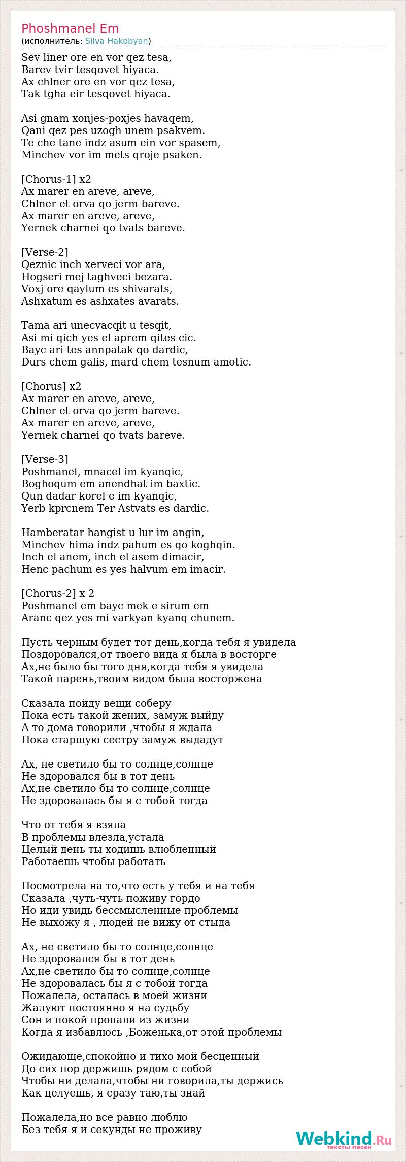 Sev liner ore en vor qez tesa, Barev tvir tesqovet hiyaca. Ax chlner ore en vor qez tesa, Tak tgha eir tesqovet hiyaca. Asi gnam xonjes-poxjes havaqem, Qani qez pes uzogh unem psakvem. Te che tane indz asum ein vor spasem, Minchev vor im mets qroje psaken. [Chorus-1] x2 Ax marer en areve, areve, Chlner et orva qo jerm bareve. Ax marer en areve, areve, Yernek charnei qo tvats bareve. [Verse-2] Qeznic inch xerveci vor ara, Hogseri mej taghveci bezara. Voxj ore qaylum es shivarats, Ashxatum es ashxates avarats. Tama ari unecvacqit u tesqit, Asi mi qich yes el aprem qites cic. Bayc ari tes annpatak qo dardic, Durs chem galis, mard chem tesnum amotic. [Chorus] x2 Ax marer en areve, areve, Chlner et orva qo jerm bareve. Ax marer en areve, areve, Yernek charnei qo tvats bareve. [Verse-3] Poshmanel, mnacel im kyanqic, Boghoqum em anendhat im baxtic. Qun dadar korel e im kyanqic, Yerb kprcnem Ter Astvats es dardic. Hamberatar hangist u lur im angin, Minchev hima indz pahum es qo koghqin. Inch el anem, inch el asem dimacir, Henc pachum es yes halvum em imacir. [Chorus-2] x 2 Poshmanel em bayc mek e sirum em Aranc qez yes mi varkyan kyanq chunem. Пусть черным будет тот день,когда тебя я увидела Поздоровался,от твоего вида я была в восторге Ах,не было бы того дня,когда тебя я увидела Такой парень,твоим видом была восторжена Сказала пойду вещи соберу Пока есть такой жених, замуж выйду А то дома говорили ,чтобы я ждала Пока старшую сестру замуж выдадут Ах, не светило бы то солнце,солнце Не здоровался бы в тот день Ах,не светило бы то солнце,солнце Не здоровалась бы я с тобой тогда Что от тебя я взяла В проблемы влезла,устала Целый день ты ходишь влюбленный Работаешь чтобы работать Посмотрела на то,что есть у тебя и на тебя Сказала ,чуть-чуть поживу гордо Но иди увидь бессмысленные проблемы Не выхожу я , людей не вижу от стыда Ах, не светило бы то солнце,солнце Не здоровался бы в тот день Ах,не светило бы то солнце,солнце Не здоровалась бы я с тобой тогда Пожалела, осталась в моей жизни Жалуют постоянно я на судьбу Сон и покой пропали из жизни Когда я избавлюсь ,Боженька,от этой проблемы Ожидающе,спокойно и тихо мой бесценный До сих пор держишь рядом с собой Чтобы ни делала,чтобы ни говорила,ты держись Как целуешь, я сразу таю,ты знай Пожалела,но все равно люблю Без тебя я и секунды не проживу