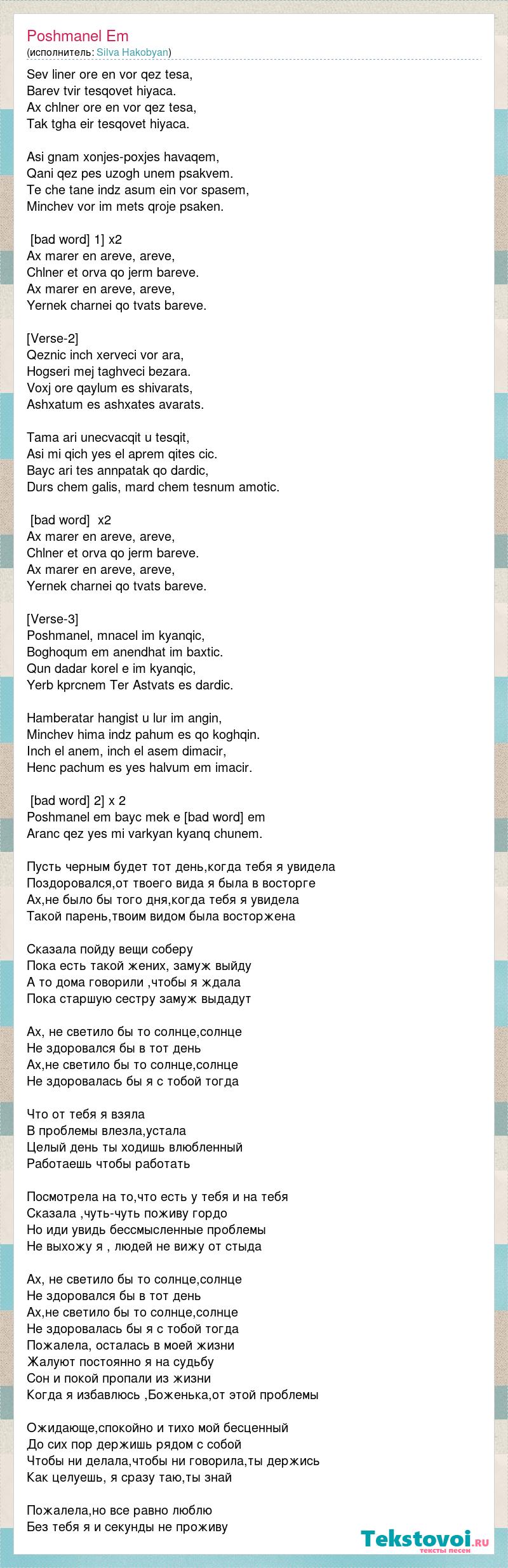 Sev liner ore en vor qez tesa, Barev tvir tesqovet hiyaca. Ax chlner ore en vor qez tesa, Tak tgha eir tesqovet hiyaca. Asi gnam xonjes-poxjes havaqem, Qani qez pes uzogh unem psakvem. Te che tane indz asum ein vor spasem, Minchev vor im mets qroje psaken. [bad word] 1] x2 Ax marer en areve, areve, Chlner et orva qo jerm bareve. Ax marer en areve, areve, Yernek charnei qo tvats bareve. [Verse-2] Qeznic inch xerveci vor ara, Hogseri mej taghveci bezara. Voxj ore qaylum es shivarats, Ashxatum es ashxates avarats. Tama ari unecvacqit u tesqit, Asi mi qich yes el aprem qites cic. Bayc ari tes annpatak qo dardic, Durs chem galis, mard chem tesnum amotic. [bad word] x2 Ax marer en areve, areve, Chlner et orva qo jerm bareve. Ax marer en areve, areve, Yernek charnei qo tvats bareve. [Verse-3] Poshmanel, mnacel im kyanqic, Boghoqum em anendhat im baxtic. Qun dadar korel e im kyanqic, Yerb kprcnem Ter Astvats es dardic. Hamberatar hangist u lur im angin, Minchev hima indz pahum es qo koghqin. Inch el anem, inch el asem dimacir, Henc pachum es yes halvum em imacir. [bad word] 2] x 2 Poshmanel em bayc mek e [bad word] em Aranc qez yes mi varkyan kyanq chunem. Пусть черным будет тот день,когда тебя я увидела Поздоровался,от твоего вида я была в восторге Ах,не было бы того дня,когда тебя я увидела Такой парень,твоим видом была восторжена Сказала пойду вещи соберу Пока есть такой жених, замуж выйду А то дома говорили ,чтобы я ждала Пока старшую сестру замуж выдадут Ах, не светило бы то солнце,солнце Не здоровался бы в тот день Ах,не светило бы то солнце,солнце Не здоровалась бы я с тобой тогда Что от тебя я взяла В проблемы влезла,устала Целый день ты ходишь влюбленный Работаешь чтобы работать Посмотрела на то,что есть у тебя и на тебя Сказала ,чуть-чуть поживу гордо Но иди увидь бессмысленные проблемы Не выхожу я , людей не вижу от стыда Ах, не светило бы то солнце,солнце Не здоровался бы в тот день Ах,не светило бы то солнце,солнце Не здоровалась бы я с тобой тогда Пожалела, осталась в моей жизни Жалуют постоянно я на судьбу Сон и покой пропали из жизни Когда я избавлюсь ,Боженька,от этой проблемы Ожидающе,спокойно и тихо мой бесценный До сих пор держишь рядом с собой Чтобы ни делала,чтобы ни говорила,ты держись Как целуешь, я сразу таю,ты знай Пожалела,но все равно люблю Без тебя я и секунды не проживу