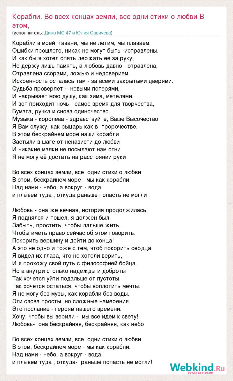 Главная→Исполнители→Дино МС 47 и Юлия Савичева→Корабли. Во всех концах земли, все одни стихи о любви В этом, бескрайн