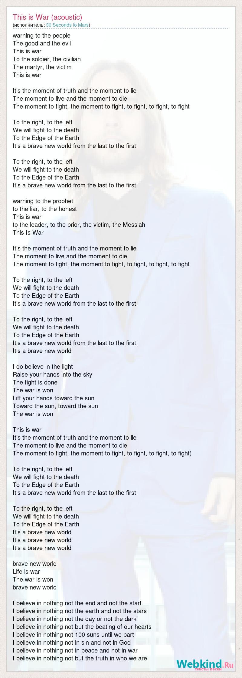warning to the people The good and the evil This is war To the soldier, the civilian The martyr, the victim This is war It's the moment of truth and the moment to lie The moment to live and the moment to die The moment to fight, the moment to fight, to fight, to fight, to fight To the right, to the left We will fight to the death To the Edge of the Earth It's a brave new world from the last to the first To the right, to the left We will fight to the death To the Edge of the Earth It's a brave new world from the last to the first warning to the prophet to the liar, to the honest This is war to the leader, to the prior, the victim, the Messiah This Is War It's the moment of truth and the moment to lie The moment to live and the moment to die The moment to fight, the moment to fight, to fight, to fight, to fight To the right, to the left We will fight to the death To the Edge of the Earth It's a brave new world from the last to the first To the right, to the left We will fight to the death To the Edge of the Earth It's a brave new world from the last to the first It's a brave new world I do believe in the light Raise your hands into the sky The fight is done The war is won Lift your hands toward the sun Toward the sun, toward the sun The war is won This is war It's the moment of truth and the moment to lie The moment to live and the moment to die The moment to fight, the moment to fight, to fight, to fight, to fight) To the right, to the left We will fight to the death To the Edge of the Earth It's a brave new world from the last to the first To the right, to the left We will fight to the death To the Edge of the Earth It's a brave new world It's a brave new world It's a brave new world brave new world Life is war The war is won brave new world I believe in nothing not the end and not the start I believe in nothing not the earth and not the stars I believe in nothing not the day or not the dark I believe in nothing not but the beating of our hearts I believe in nothing not 100 suns until we part I believe in nothing not in sin and not in God I believe in nothing not in peace and not in war I believe in nothing not but the truth in who we are