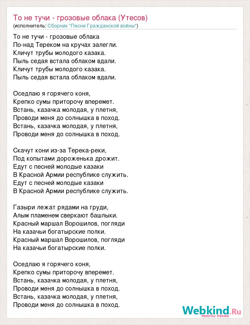 То не тучи - грозовые облака По-над Тереком на кручах залегли. Кличут трубы молодого казака. Пыль седая встала облаком вдали. Кличут трубы молодого казака. Пыль седая встала облаком вдали. Оседлаю я горячего коня, Крепко сумы приторочу вперемет. Встань, казачка молодая, у плетня, Проводи меня до солнышка в поход. Встань, казачка молодая, у плетня, Проводи меня до солнышка в поход. Скачут кони из-за Терека-реки, Под копытами дороженька дрожит. Едут с песней молодые казаки В Красной Армии республике служить. Едут с песней молодые казаки В Красной Армии республике служить. Газыри лежат рядами на груди, Алым пламенем сверкают башлыки. Красный маршал Ворошилов, погляди На казачьи богатырские полки. Красный маршал Ворошилов, погляди На казачьи богатырские полки. Оседлаю я горячего коня, Крепко сумы приторочу вперемет. Встань, казачка молодая, у плетня, Проводи меня до солнышка в поход. Встань, казачка молодая, у плетня, Проводи меня до солнышка в поход.