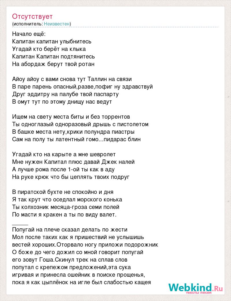 Начало ещё: Капитан капитан улыбнитесь Угадай кто берёт на клыка Капитан Капитан подтянитесь На абордаж берут твой ротан Айоу айоу с вами снова тут Таллин на связи В паре парень опасный,разве,пофиг ну здравствуй Друг эддитру на палубе твой паспарту В омут тут по этому днищу нас ведут Ищем на свету места биты и без торрентов Ты одноглазый одноразовый дрышь с пистолетом В башке места нету,крики полундра пиастры Сам на полу ты латентный гомо...пидарас блин Угадай кто на карыте а мне шевролет Мне нужен Капитал плюс давай Джек налей А лучше рома после 1-ой ты как в аду На руке крюк что бы цеплять твоих подруг В пиратской бухте не спокойно и дня Я так крут что оседлал морского конька Ты колхозник месяца-гроза семи полей По масти я кракен а ты по виду валет. _____ Попугай на плече сказал делать по жести Мол после таких как я пришествий не услышишь вестей хороших.Оторвало ногу приложи подорожник О боже до чего дожил со мной говорит попугай его зовут Гоша.Скинул трек на сплав слов попутал с крепежом предложений,эта сука игривая и принесла ошейник в поиске прощенья, пока я как цыплёнок на игле был слабостью кащея