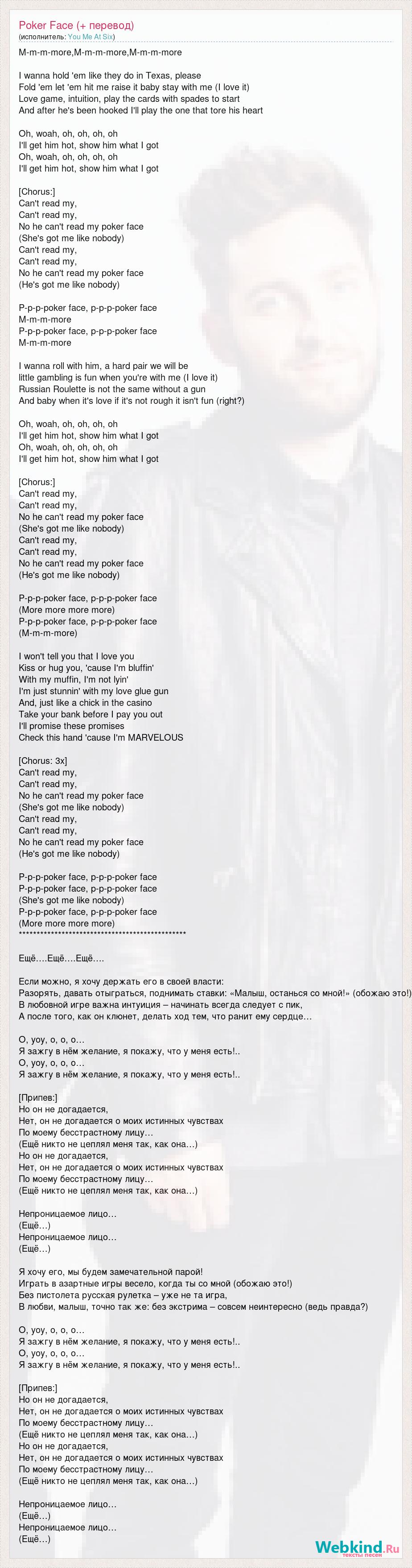 M-m-m-more,M-m-m-more,M-m-m-more I wanna hold 'em like they do in Texas, please Fold 'em let 'em hit me raise it baby stay with me (I love it) Love game, intuition, play the cards with spades to start And after he's been hooked I'll play the one that tore his heart Oh, woah, oh, oh, oh, oh I'll get him hot, show him what I got Oh, woah, oh, oh, oh, oh I'll get him hot, show him what I got [Chorus:] Can't read my, Can't read my, No he can't read my poker face (She's got me like nobody) Can't read my, Can't read my, No he can't read my poker face (He's got me like nobody) P-p-p-poker face, p-p-p-poker face M-m-m-more P-p-p-poker face, p-p-p-poker face M-m-m-more I wanna roll with him, a hard pair we will be little gambling is fun when you're with me (I love it) Russian Roulette is not the same without a gun And baby when it's love if it's not rough it isn't fun (right?) Oh, woah, oh, oh, oh, oh I'll get him hot, show him what I got Oh, woah, oh, oh, oh, oh I'll get him hot, show him what I got [Chorus:] Can't read my, Can't read my, No he can't read my poker face (She's got me like nobody) Can't read my, Can't read my, No he can't read my poker face (He's got me like nobody) P-p-p-poker face, p-p-p-poker face (More more more more) P-p-p-poker face, p-p-p-poker face (M-m-m-more) I won't tell you that I love you Kiss or hug you, 'cause I'm bluffin' With my muffin, I'm not lyin' I'm just stunnin' with my love glue gun And, just like a chick in the casino Take your bank before I pay you out I'll promise these promises Check this hand 'cause I'm MARVELOUS [Chorus: 3x] Can't read my, Can't read my, No he can't read my poker face (She's got me like nobody) Can't read my, Can't read my, No he can't read my poker face (He's got me like nobody) P-p-p-poker face, p-p-p-poker face P-p-p-poker face, p-p-p-poker face (She's got me like nobody) P-p-p-poker face, p-p-p-poker face (More more more more) *********************************************** Ещё….Ещё….Ещё…. Если можно, я хочу держать его в своей власти: Разорять, давать отыграться, поднимать ставки: «Малыш, останься со мной!» (обожаю это!) В любовной игре важна интуиция – начинать всегда следует с пик, А после того, как он клюнет, делать ход тем, что ранит ему сердце… О, уоу, о, о, о… Я зажгу в нём желание, я покажу, что у меня есть!.. О, уоу, о, о, о… Я зажгу в нём желание, я покажу, что у меня есть!.. [Припев:] Но он не догадается, Нет, он не догадается о моих истинных чувствах По моему бесстрастному лицу… (Ещё никто не цеплял меня так, как она…) Но он не догадается, Нет, он не догадается о моих истинных чувствах По моему бесстрастному лицу… (Ещё никто не цеплял меня так, как она…) Непроницаемое лицо… (Ещё…) Непроницаемое лицо… (Ещё…) Я хочу его, мы будем замечательной парой! Играть в азартные игры весело, когда ты со мной (обожаю это!) Без пистолета русская рулетка – уже не та игра, В любви, малыш, точно так же: без экстрима – совсем неинтересно (ведь правда?) О, уоу, о, о, о… Я зажгу в нём желание, я покажу, что у меня есть!.. О, уоу, о, о, о… Я зажгу в нём желание, я покажу, что у меня есть!.. [Припев:] Но он не догадается, Нет, он не догадается о моих истинных чувствах По моему бесстрастному лицу… (Ещё никто не цеплял меня так, как она…) Но он не догадается, Нет, он не догадается о моих истинных чувствах По моему бесстрастному лицу… (Ещё никто не цеплял меня так, как она…) Непроницаемое лицо… (Ещё…) Непроницаемое лицо… (Ещё…)