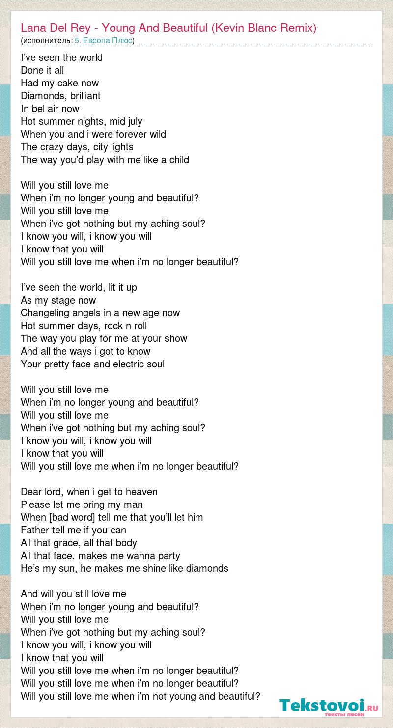 I’ve seen the world Done it all Had my cake now Diamonds, brilliant In bel air now Hot summer nights, mid july When you and i were forever wild The crazy days, city lights The way you’d play with me like a child Will you still love me When i’m no longer young and beautiful? Will you still love me When i’ve got nothing but my aching soul? I know you will, i know you will I know that you will Will you still love me when i’m no longer beautiful? I’ve seen the world, lit it up As my stage now Changeling angels in a new age now Hot summer days, rock n roll The way you play for me at your show And all the ways i got to know Your pretty face and electric soul Will you still love me When i’m no longer young and beautiful? Will you still love me When i’ve got nothing but my aching soul? I know you will, i know you will I know that you will Will you still love me when i’m no longer beautiful? Dear lord, when i get to heaven Please let me bring my man When he comes tell me that you’ll let him Father tell me if you can All that grace, all that body All that face, makes me wanna party He’s my sun, he makes me shine like diamonds And will you still love me When i’m no longer young and beautiful? Will you still love me When i’ve got nothing but my aching soul? I know you will, i know you will I know that you will Will you still love me when i’m no longer beautiful? Will you still love me when i’m no longer beautiful? Will you still love me when i’m not young and beautiful?