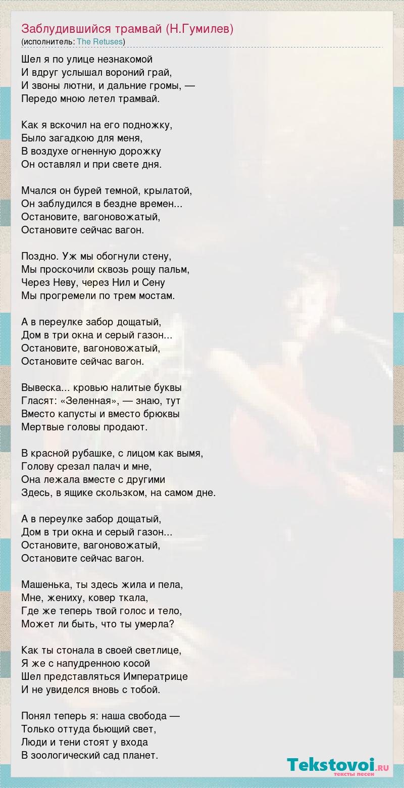 Шел я по улице незнакомой И вдруг услышал вороний грай, И звоны лютни, и дальние громы, — Передо мною летел трамвай. Как я вскочил на его подножку, Было загадкою для меня, В воздухе огненную дорожку Он оставлял и при свете дня. Мчался он бурей темной, крылатой, Он заблудился в бездне времен... Остановите, вагоновожатый, Остановите сейчас вагон. Поздно. Уж мы обогнули стену, Мы проскочили сквозь рощу пальм, Через Неву, через Нил и Сену Мы прогремели по трем мостам. А в переулке забор дощатый, Дом в три окна и серый газон... Остановите, вагоновожатый, Остановите сейчас вагон. Вывеска... кровью налитые буквы Гласят: «Зеленная», — знаю, тут Вместо капусты и вместо брюквы Мертвые головы продают. В красной рубашке, с лицом как вымя, Голову срезал палач и мне, Она лежала вместе с другими Здесь, в ящике скользком, на самом дне. А в переулке забор дощатый, Дом в три окна и серый газон... Остановите, вагоновожатый, Остановите сейчас вагон. Машенька, ты здесь жила и пела, Мне, жениху, ковер ткала, Где же теперь твой голос и тело, Может ли быть, что ты умерла? Как ты стонала в своей светлице, Я же с напудренною косой Шел представляться Императрице И не увиделся вновь с тобой. Понял теперь я: наша свобода — Только оттуда бьющий свет, Люди и тени стоят у входа В зоологический сад планет.