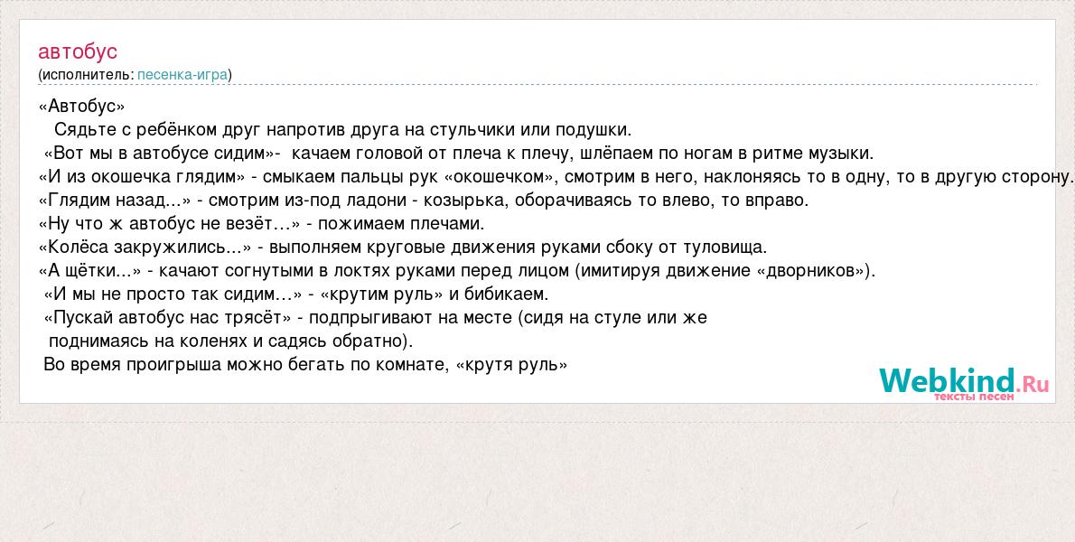 «Автобус» Сядьте с ребёнком друг напротив друга на стульчики или подушки. «Вот мы в автобусе сидим»- качаем головой от плеча к плечу, шлёпаем по ногам в ритме музыки. «И из окошечка глядим» - смыкаем пальцы рук «окошечком», смотрим в него, наклоняясь то в одну, то в другую сторону. «Глядим назад...» - смотрим из-под ладони - козырька, оборачиваясь то влево, то вправо. «Ну что ж автобус не везёт…» - пожимаем плечами. «Колёса закружились...» - выполняем круговые движения руками сбоку от туловища. «А щётки...» - качают согнутыми в локтях руками перед лицом (имитируя движение «дворников»). «И мы не просто так сидим…» - «крутим руль» и бибикаем. «Пускай автобус нас трясёт» - подпрыгивают на месте (сидя на стуле или же поднимаясь на коленях и садясь обратно). Во время проигрыша можно бегать по комнате, «крутя руль»