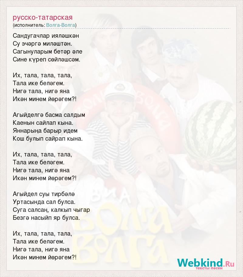 Сандугачлар ияләшкән Су эчәргә миләштән. Сагынуларым бетәр әле Сине күреп сөйләшсәм. Их, тала, тала, тала, Тала ике беләгем. Нигә тала, нигә яна Икән минем йөрәгем?! Агыйделгә басма салдым Каенын сайлап кына. Яннарыңа барыр идем Кош булып сайрап кына. Их, тала, тала, тала, Тала ике беләгем. Нигә тала, нигә яна Икән минем йөрәгем?! Агыйдел суы тирбәлә Уртасында сал булса. Суга салсаң, калкып чыгар Безгә насыйп яр булса. Их, тала, тала, тала, Тала ике беләгем. Нигә тала, нигә яна Икән минем йөрәгем?!