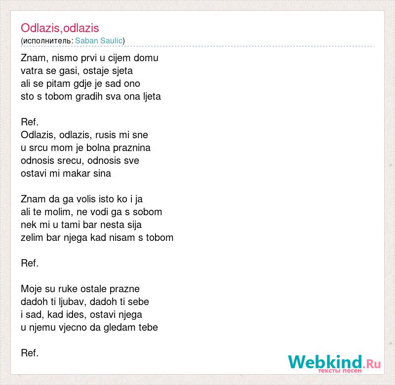 Znam, nismo prvi u cijem domu vatra se gasi, ostaje sjeta ali se pitam gdje je sad ono sto s tobom gradih sva ona ljeta Ref. Odlazis, odlazis, rusis mi sne u srcu mom je bolna praznina odnosis srecu, odnosis sve ostavi mi makar sina Znam da ga volis isto ko i ja ali te molim, ne vodi ga s sobom nek mi u tami bar nesta sija zelim bar njega kad nisam s tobom Ref. Moje su ruke ostale prazne dadoh ti ljubav, dadoh ti sebe i sad, kad ides, ostavi njega u njemu vjecno da gledam tebe Ref.