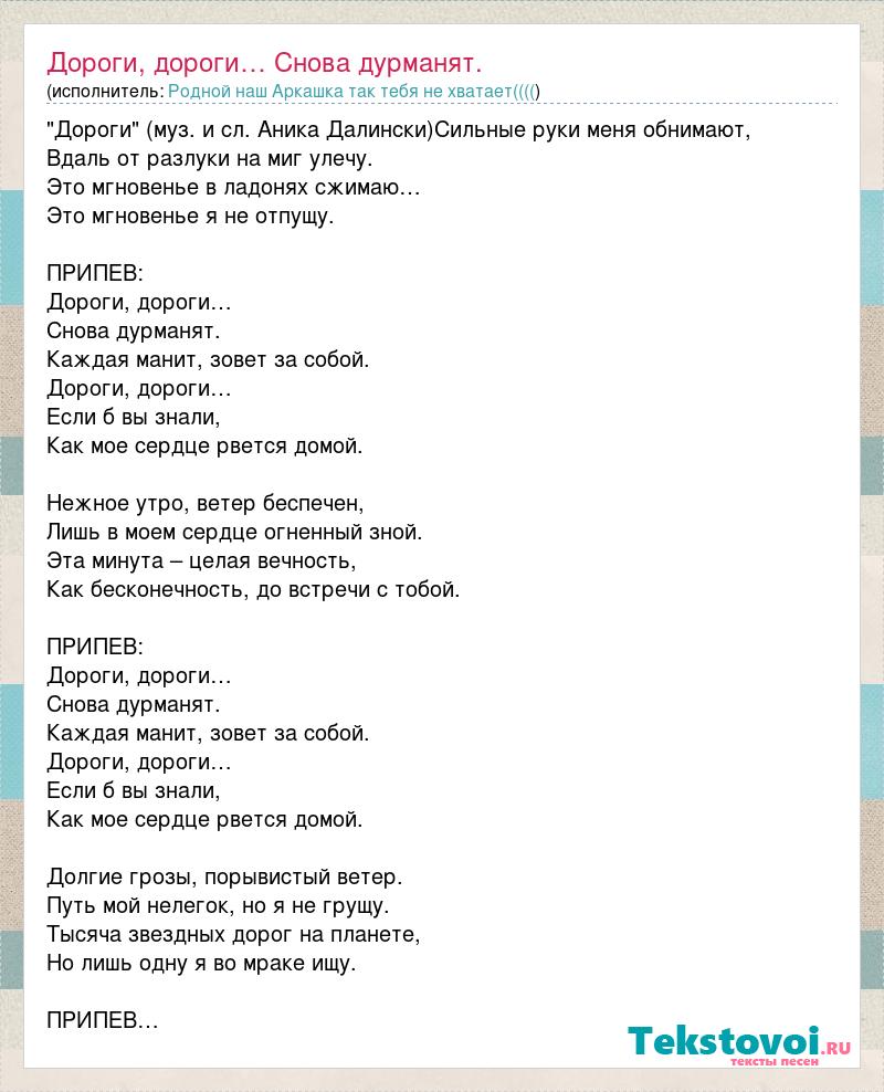 "Дороги" (муз. и сл. Аника Далински)Сильные руки меня обнимают, Вдаль от разлуки на миг улечу. Это мгновенье в ладонях сжимаю… Это мгновенье я не отпущу. ПРИПЕВ: Дороги, дороги… Снова дурманят. Каждая манит, зовет за собой. Дороги, дороги… Если б вы знали, Как мое сердце рвется домой. Нежное утро, ветер беспечен, Лишь в моем сердце огненный зной. Эта минута – целая вечность, Как бесконечность, до встречи с тобой. ПРИПЕВ: Дороги, дороги… Снова дурманят. Каждая манит, зовет за собой. Дороги, дороги… Если б вы знали, Как мое сердце рвется домой. Долгие грозы, порывистый ветер. Путь мой нелегок, но я не грущу. Тысяча звездных дорог на планете, Но лишь одну я во мраке ищу. ПРИПЕВ…