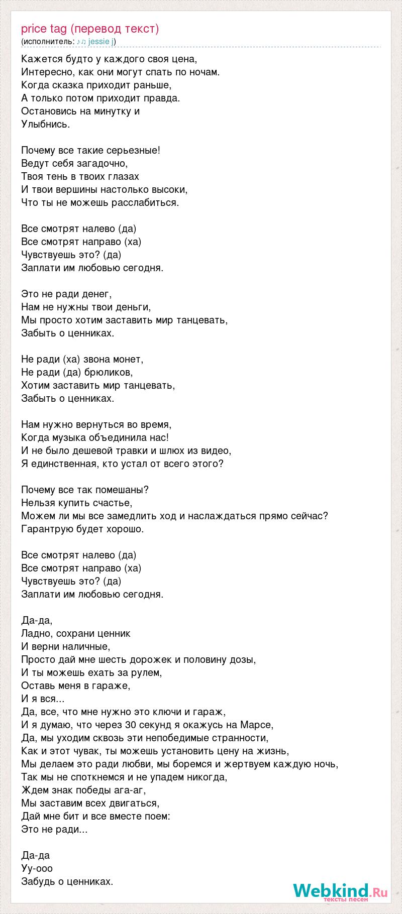 Кажется будто у каждого своя цена, Интересно, как они могут спать по ночам. Когда сказка приходит раньше, А только потом приходит правда. Остановись на минутку и Улыбнись. Почему все такие серьезные! Ведут себя загадочно, Твоя тень в твоих глазах И твои вершины настолько высоки, Что ты не можешь расслабиться. Все смотрят налево (да) Все смотрят направо (ха) Чувствуешь это? (да) Заплати им любовью сегодня. Это не ради денег, Нам не нужны твои деньги, Мы просто хотим заставить мир танцевать, Забыть о ценниках. Не ради (ха) звона монет, Не ради (да) брюликов, Хотим заставить мир танцевать, Забыть о ценниках. Нам нужно вернуться во время, Когда музыка объединила нас! И не было дешевой травки и шлюх из видео, Я единственная, кто устал от всего этого? Почему все так помешаны? Нельзя купить счастье, Можем ли мы все замедлить ход и наслаждаться прямо сейчас? Гарантрую будет хорошо. Все смотрят налево (да) Все смотрят направо (ха) Чувствуешь это? (да) Заплати им любовью сегодня. Да-да, Ладно, сохрани ценник И верни наличные, Просто дай мне шесть дорожек и половину дозы, И ты можешь ехать за рулем, Оставь меня в гараже, И я вся... Да, все, что мне нужно это ключи и гараж, И я думаю, что через 30 секунд я окажусь на Марсе, Да, мы уходим сквозь эти непобедимые странности, Как и этот чувак, ты можешь установить цену на жизнь, Мы делаем это ради любви, мы боремся и жертвуем каждую ночь, Так мы не споткнемся и не упадем никогда, Ждем знак победы ага-аг, Мы заставим всех двигаться, Дай мне бит и все вместе поем: Это не ради... Да-да Уу-ооо Забудь о ценниках.