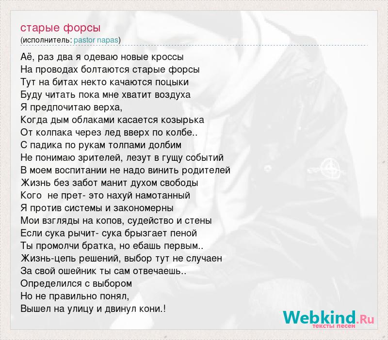 Аё, раз два я одеваю новые кроссы На проводах болтаются старые форсы Тут на битах некто качаются поцыки Буду читать пока мне хватит воздуха Я предпочитаю верха, Когда дым облаками касается козырька От колпака через лед вверх по колбе.. С падика по рукам толпами долбим Не понимаю зрителей, лезут в гущу событий В моем воспитании не надо винить родителей Жизнь без забот манит духом свободы Кого не прет- это нахуй намотанный Я против системы и закономерны Мои взгляды на копов, судейство и стены Если сука рычит- сука брызгает пеной Ты промолчи братка, но ебашь первым.. Жизнь-цепь решений, выбор тут не случаен За свой ошейник ты сам отвечаешь.. Определился с выбором Но не правильно понял, Вышел на улицу и двинул кони.!