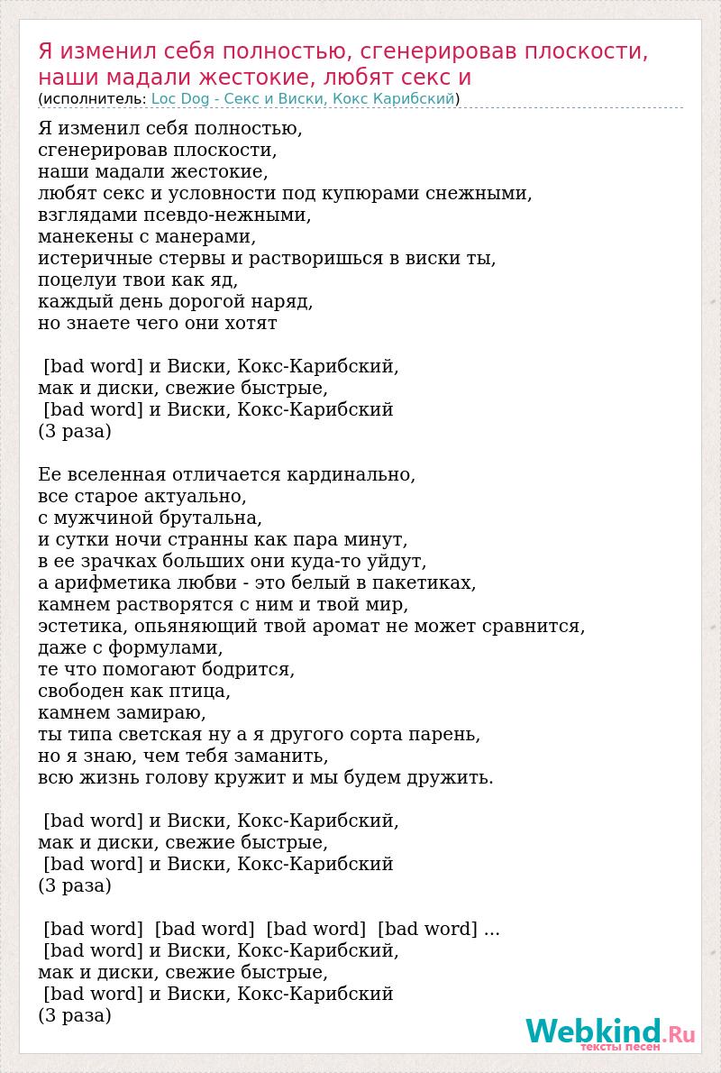 Я изменил себя полностью, сгенерировав плоскости, наши мадали жестокие, любят секс и условности под купюрами снежными, взглядами псевдо-нежными, манекены с манерами, истеричные стервы и растворишься в виски ты, поцелуи твои как яд, каждый день дорогой наряд, но знаете чего они хотят [bad word] и Виски, Кокс-Карибский, мак и диски, свежие быстрые, [bad word] и Виски, Кокс-Карибский (3 раза) Ее вселенная отличается кардинально, все старое актуально, с мужчиной брутальна, и сутки ночи странны как пара минут, в ее зрачках больших они куда-то уйдут, а арифметика любви - это белый в пакетиках, камнем растворятся с ним и твой мир, эстетика, опьяняющий твой аромат не может сравнится, даже с формулами, те что помогают бодрится, свободен как птица, камнем замираю, ты типа светская ну а я другого сорта парень, но я знаю, чем тебя заманить, всю жизнь голову кружит и мы будем дружить. [bad word] и Виски, Кокс-Карибский, мак и диски, свежие быстрые, [bad word] и Виски, Кокс-Карибский (3 раза) [bad word] [bad word] [bad word] [bad word] ... [bad word] и Виски, Кокс-Карибский, мак и диски, свежие быстрые, [bad word] и Виски, Кокс-Карибский (3 раза)