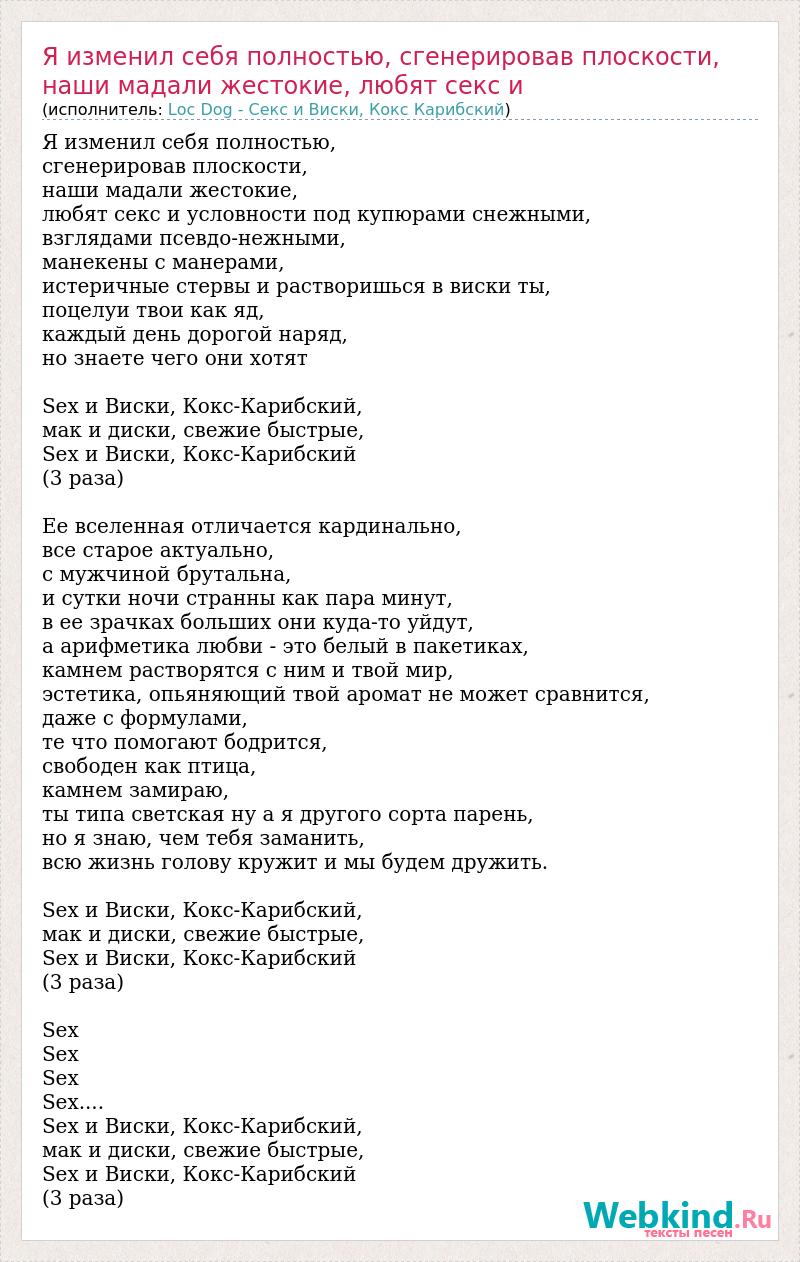 Я изменил себя полностью, сгенерировав плоскости, наши мадали жестокие, любят секс и условности под купюрами снежными, взглядами псевдо-нежными, манекены с манерами, истеричные стервы и растворишься в виски ты, поцелуи твои как яд, каждый день дорогой наряд, но знаете чего они хотят Sex и Виски, Кокс-Карибский, мак и диски, свежие быстрые, Sex и Виски, Кокс-Карибский (3 раза) Ее вселенная отличается кардинально, все старое актуально, с мужчиной брутальна, и сутки ночи странны как пара минут, в ее зрачках больших они куда-то уйдут, а арифметика любви - это белый в пакетиках, камнем растворятся с ним и твой мир, эстетика, опьяняющий твой аромат не может сравнится, даже с формулами, те что помогают бодрится, свободен как птица, камнем замираю, ты типа светская ну а я другого сорта парень, но я знаю, чем тебя заманить, всю жизнь голову кружит и мы будем дружить. Sex и Виски, Кокс-Карибский, мак и диски, свежие быстрые, Sex и Виски, Кокс-Карибский (3 раза) Sex Sex Sex Sex.... Sex и Виски, Кокс-Карибский, мак и диски, свежие быстрые, Sex и Виски, Кокс-Карибский (3 раза)