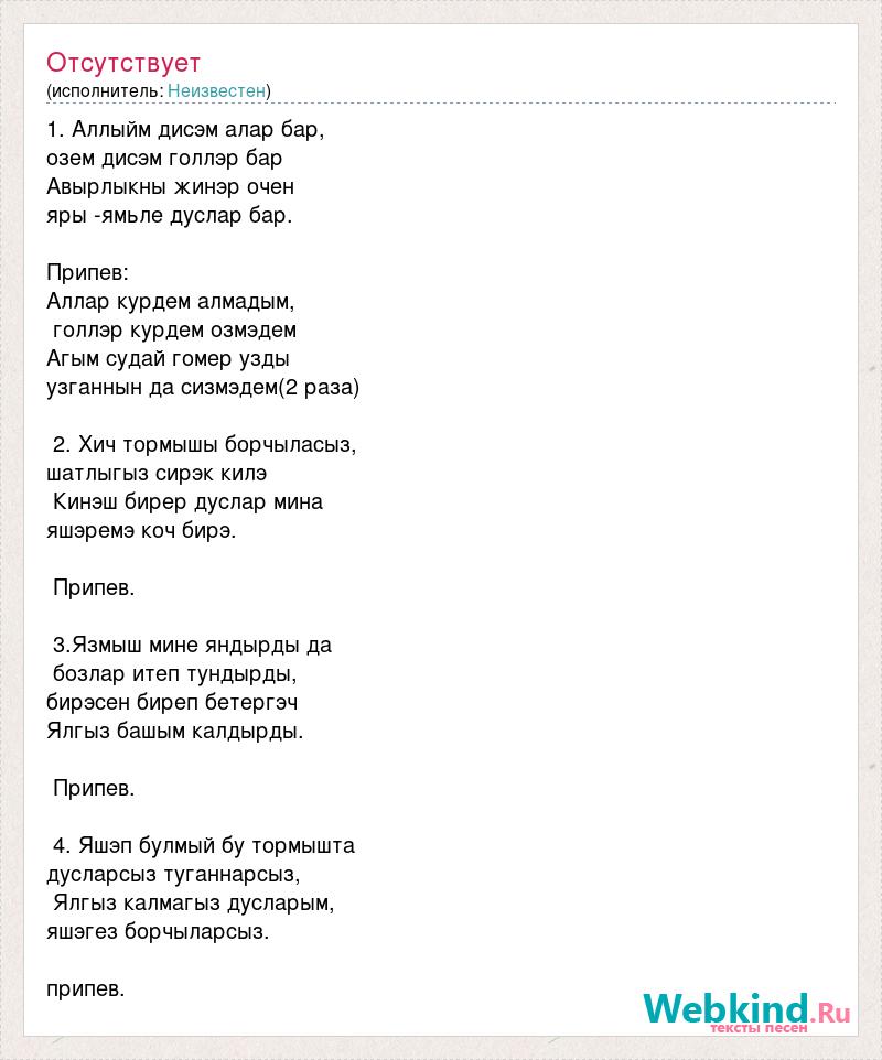 1. Аллыйм дисэм алар бар, озем дисэм голлэр бар Авырлыкны жинэр очен яры -ямьле дуслар бар. Припев: Аллар курдем алмадым, голлэр курдем озмэдем Агым судай гомер узды узганнын да сизмэдем(2 раза) 2. Хич тормышы борчыласыз, шатлыгыз сирэк килэ Кинэш бирер дуслар мина яшэремэ коч бирэ. Припев. 3.Язмыш мине яндырды да бозлар итеп тундырды, бирэсен биреп бетергэч Ялгыз башым калдырды. Припев. 4. Яшэп булмый бу тормышта дусларсыз туганнарсыз, Ялгыз калмагыз дусларым, яшэгез борчыларсыз. припев.