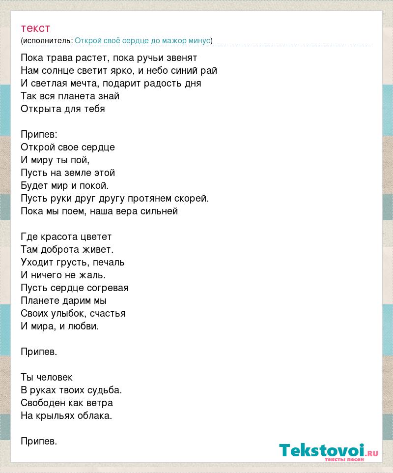 Пока трава растет, пока ручьи звенят Нам солнце светит ярко, и небо синий рай И светлая мечта, подарит радость дня Так вся планета знай Открыта для тебя Припев: Открой свое сердце И миру ты пой, Пусть на земле этой Будет мир и покой. Пусть руки друг другу протянем скорей. Пока мы поем, наша вера сильней Где красота цветет Там доброта живет. Уходит грусть, печаль И ничего не жаль. Пусть сердце согревая Планете дарим мы Своих улыбок, счастья И мира, и любви. Припев. Ты человек В руках твоих судьба. Свободен как ветра На крыльях облака. Припев.