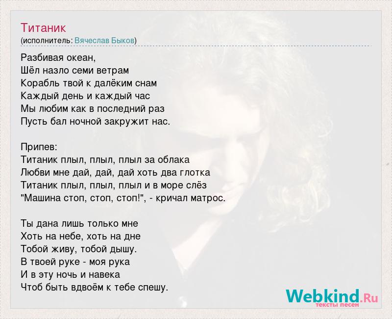 Разбивая океан, Шёл назло семи ветрам Корабль твой к далёким снам Каждый день и каждый час Мы любим как в последний раз Пусть бал ночной закружит нас. Припев: Титаник плыл, плыл, плыл за облака Любви мне дай, дай, дай хоть два глотка Титаник плыл, плыл, плыл и в море слёз "Машина стоп, стоп, стоп!", - кричал матрос. Ты дана лишь только мне Хоть на небе, хоть на дне Тобой живу, тобой дышу. В твоей руке - моя рука И в эту ночь и навека Чтоб быть вдвоём к тебе спешу.
