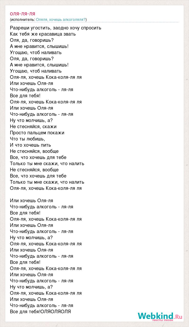 Разреши угостить, заодно хочу спросить Как тебя же красавица звать Оля, да, говоришь? А мне нравится, слышишь! Угощаю, чтоб наливать Оля, да, говоришь? А мне нравится, слышишь! Угощаю, чтоб наливать Оля-ля, хочешь Кока-коля-ля ля Или хочешь Оля-ля Что-нибудь алкоголь - ля-ля Все для тебя! Оля-ля, хочешь Кока-коля-ля ля Или хочешь Оля-ля Что-нибудь алкоголь - ля-ля Ну что молчишь, а? Не стесняйся, скажи Просто пальцем покажи Что ты любишь, И что хочешь пить Не стесняйся, вообще Все, что хочешь для тебе Только ты мне скажи, что налить Не стесняйся, вообще Все, что хочешь для тебе Только ты мне скажи, что налить Оля-ля, хочешь Кока-коля-ля ля Или хочешь Оля-ля Что-нибудь алкоголь - ля-ля Все для тебя! Оля-ля, хочешь Кока-коля-ля ля Или хочешь Оля-ля Что-нибудь алкоголь - ля-ля Ну что молчишь, а? Оля-ля, хочешь Кока-коля-ля ля Или хочешь Оля-ля Что-нибудь алкоголь - ля-ля Все для тебя! Оля-ля, хочешь Кока-коля-ля ля Или хочешь Оля-ля Что-нибудь алкоголь - ля-ля Ну что молчишь, а? Оля-ля, хочешь Кока-коля-ля ля Или хочешь Оля-ля Что-нибудь алкоголь - ля-ля Все для тебя!ОЛЯОЛЯОЛЯ