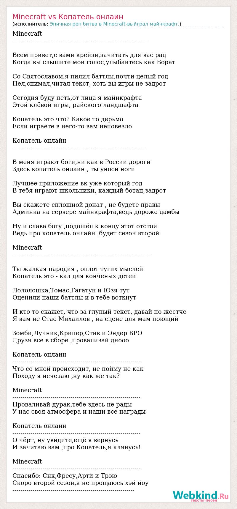 Minecraft -------------------------------------------------------------------- Всем привет,с вами крейзи,зачитать для вас рад Когда вы слышите мой голос,улыбайтесь как Борат Со Святославом,я пилил баттлы,почти целый год Пел,снимал,читал текст, хоть вы игры не задрот Сегодня буду петь,от лица я майнкрафта Этой клёвой игры, райского ландшафта Копатель это что? Какое то дерьмо Если играете в него-то вам неповезло Копатель онлайн ------------------------------------------------------------------- В меня играют боги,ни как в России дороги Здесь копатель онлайн , ты уноси ноги Лучшее приложение вк уже который год В тебя играют школьники, каждый ботан,задрот Вы скажете сплошной донат , не будете правы Админка на сервере майнкрафта,ведь дороже дамбы Ну и слава богу ,подошёл к концу этот отстой Ведь про копатель онлайн ,будет сезон второй Minecraft --------------------------------------------------------------------- Ты жалкая пародия , оплот тугих мыслей Копатель это - кал для конченых детей Лололошка,Томас,Гагатун и Юзя тут Оценили наши баттлы и в тебе воткнут И кто-то скажет, что за глупый текст, давай по жестче Я вам не Стас Михаилов , на сцене для мам поющий Зомби,Лучник,Крипер,Стив и Эндер БРО Друзя все в сборе ,проваливай днооо Копатель онлаин ---------------------------------------------------------------- Что со мной происходит, не пойму не как Походу я исчезаю ,ну как же так? Minecraft ---------------------------------------------------------------- Проваливай дурак,тебе здесь не рады У нас своя атмосфера и наши все награды Копатель онлаин ---------------------------------------------------------------- О чёрт, ну увидите,ещё я вернусь И зачитаю вам ,про Копатель,я клянусь! Minecraft ---------------------------------------------------------------- Спасибо: Снк,Фресу,Арти и Трэю Скоро второй сезон,я не прощаюсь хэй йоу -------------------------------------------------------------