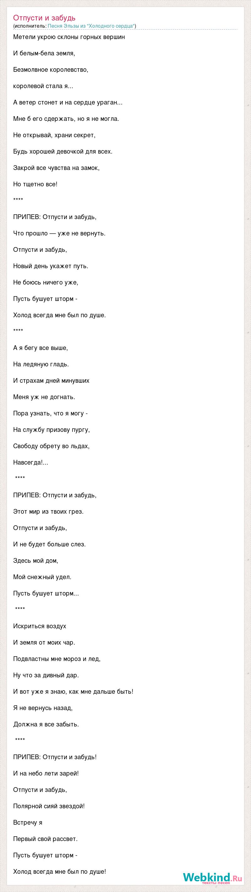 Метели укрою склоны горных вершин И белым-бела земля, Безмолвное королевство, королевой стала я... А ветер стонет и на сердце ураган... Мне б его сдержать, но я не могла. Не открывай, храни секрет, Будь хорошей девочкой для всех. Закрой все чувства на замок, Но тщетно все! **** ПРИПЕВ: Отпусти и забудь, Что прошло — уже не вернуть. Отпусти и забудь, Новый день укажет путь. Не боюсь ничего уже, Пусть бушует шторм - Холод всегда мне был по душе. **** А я бегу все выше, На ледяную гладь. И страхам дней минувших Меня уж не догнать. Пора узнать, что я могу - На службу призову пургу, Свободу обрету во льдах, Навсегда!... **** ПРИПЕВ: Отпусти и забудь, Этот мир из твоих грез. Отпусти и забудь, И не будет больше слез. Здесь мой дом, Мой снежный удел. Пусть бушует шторм... **** Искриться воздух И земля от моих чар. Подвластны мне мороз и лед, Ну что за дивный дар. И вот уже я знаю, как мне дальше быть! Я не вернусь назад, Должна я все забыть. **** ПРИПЕВ: Отпусти и забудь! И на небо лети зарей! Отпусти и забудь, Полярной сияй звездой! Встречу я Первый свой рассвет. Пусть бушует шторм - Холод всегда мне был по душе!