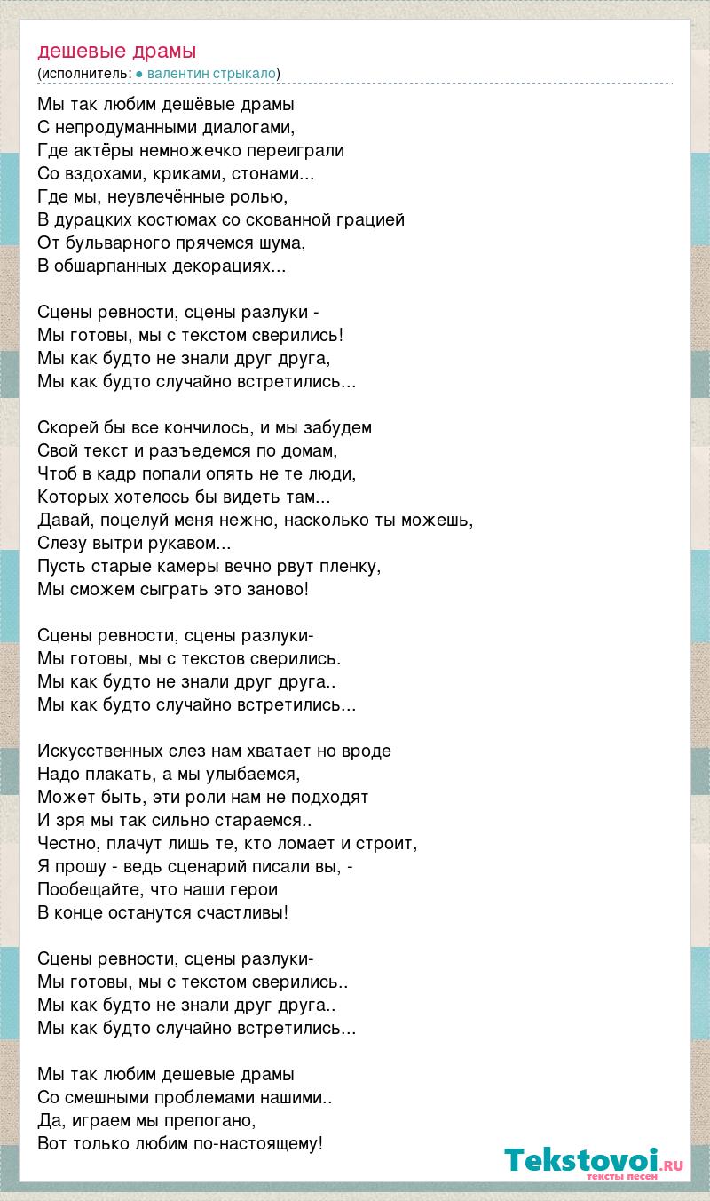 Мы так любим дешёвые драмы С непродуманными диалогами, Где актёры немножечко переиграли Со вздохами, криками, стонами... Где мы, неувлечённые ролью, В дурацких костюмах со скованной грацией От бульварного прячемся шума, В обшарпанных декорациях... Сцены ревности, сцены разлуки - Мы готовы, мы с текстом сверились! Мы как будто не знали друг друга, Мы как будто случайно встретились... Скорей бы все кончилось, и мы забудем Свой текст и разъедемся по домам, Чтоб в кадр попали опять не те люди, Которых хотелось бы видеть там... Давай, поцелуй меня нежно, насколько ты можешь, Слезу вытри рукавом... Пусть старые камеры вечно рвут пленку, Мы сможем сыграть это заново! Сцены ревности, сцены разлуки- Мы готовы, мы с текстов сверились. Мы как будто не знали друг друга.. Мы как будто случайно встретились... Искусственных слез нам хватает но вроде Надо плакать, а мы улыбаемся, Может быть, эти роли нам не подходят И зря мы так сильно стараемся.. Честно, плачут лишь те, кто ломает и строит, Я прошу - ведь сценарий писали вы, - Пообещайте, что наши герои В конце останутся счастливы! Сцены ревности, сцены разлуки- Мы готовы, мы с текстом сверились.. Мы как будто не знали друг друга.. Мы как будто случайно встретились... Мы так любим дешевые драмы Со смешными проблемами нашими.. Да, играем мы препогано, Вот только любим по-настоящему!