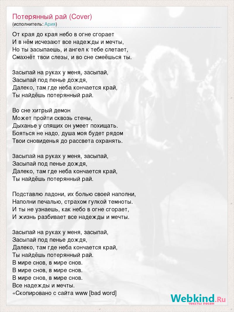От края до края небо в огне сгорает И в нём исчезают все надежды и мечты, Но ты засыпаешь, и ангел к тебе слетает, Смахнёт твои слезы, и во сне смеёшься ты. 3асыпай на руках у меня, засыпай, Засыпай под пенье дождя, Далеко, там где неба кончается край, Ты найдёшь потерянный рай. Во сне хитрый демон Может пройти сквозь стены, Дыханье у спящих он умеет похищать. Бояться не надо, душа моя будет рядом Твои сновиденья до рассвета охранять. 3асыпай на руках у меня, засыпай, Засыпай под пенье дождя, Далеко, там где неба кончается край, Ты найдёшь потерянный рай. Подставлю ладони, их болью своей наполни, Наполни печалью, страхом гулкой темноты. И ты не узнаешь, как небо в огне сгорает, И жизнь разбивает все надежды и мечты. 3асыпай на руках у меня, засыпай, Засыпай под пенье дождя, Далеко, там где неба кончается край, Ты найдёшь потерянный рай. В мире снов, в мире снов. В мире снов, в мире снов. В мире снов, в мире снов. Все надежды и мечты. «Скопировано с сайта www [bad word]