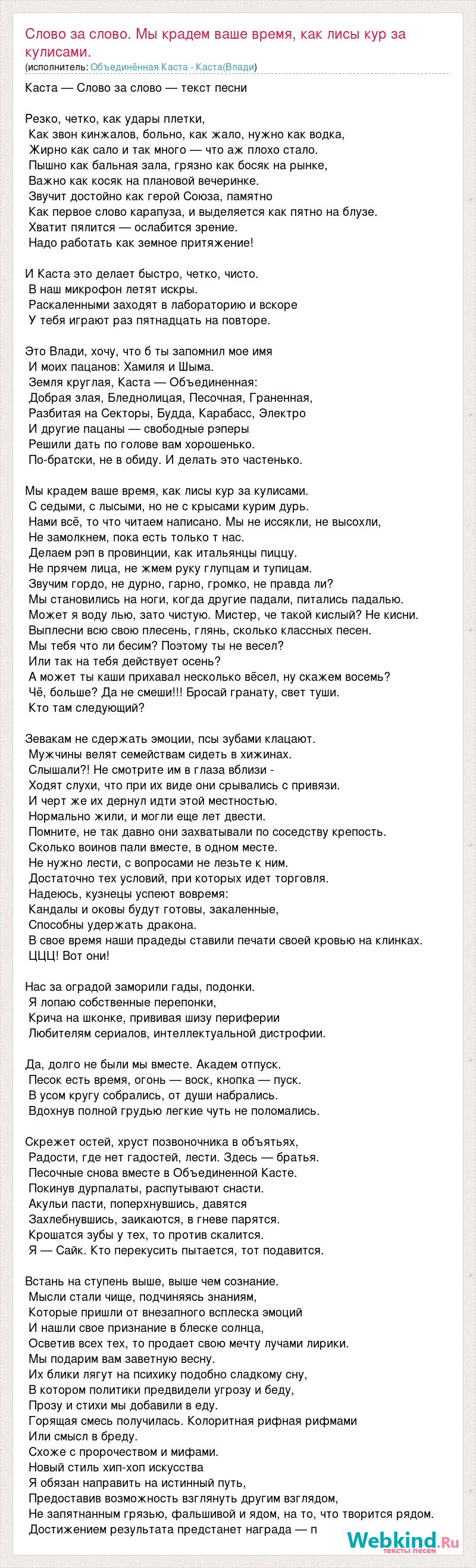 Каста — Слово за слово — текст песни Резко, четко, как удары плетки, Как звон кинжалов, больно, как жало, нужно как водка, Жирно как сало и так много — что аж плохо стало. Пышно как бальная зала, грязно как босяк на рынке, Важно как косяк на плановой вечеринке. Звучит достойно как герой Союза, памятно Как первое слово карапуза, и выделяется как пятно на блузе. Хватит пялится — ослабится зрение. Надо работать как земное притяжение! И Каста это делает быстро, четко, чисто. В наш микрофон летят искры. Раскаленными заходят в лабораторию и вскоре У тебя играют раз пятнадцать на повторе. Это Влади, хочу, что б ты запомнил мое имя И моих пацанов: Хамиля и Шыма. Земля круглая, Каста — Объединенная: Добрая злая, Бледнолицая, Песочная, Граненная, Разбитая на Секторы, Будда, Карабасс, Электро И другие пацаны — свободные рэперы Решили дать по голове вам хорошенько. По-братски, не в обиду. И делать это частенько. Мы крадем ваше время, как лисы кур за кулисами. С седыми, с лысыми, но не с крысами курим дурь. Нами всё, то что читаем написано. Мы не иссякли, не высохли, Не замолкнем, пока есть только т нас. Делаем рэп в провинции, как итальянцы пиццу. Не прячем лица, не жмем руку глупцам и тупицам. Звучим гордо, не дурно, гарно, громко, не правда ли? Мы становились на ноги, когда другие падали, питались падалью. Может я воду лью, зато чистую. Мистер, че такой кислый? Не кисни. Выплесни всю свою плесень, глянь, сколько классных песен. Мы тебя что ли бесим? Поэтому ты не весел? Или так на тебя действует осень? А может ты каши прихавал несколько вёсел, ну скажем восемь? Чё, больше? Да не смеши!!! Бросай гранату, свет туши. Кто там следующий? Зевакам не сдержать эмоции, псы зубами клацают. Мужчины велят семействам сидеть в хижинах. Слышали?! Не смотрите им в глаза вблизи - Ходят слухи, что при их виде они срывались с привязи. И черт же их дернул идти этой местностью. Нормально жили, и могли еще лет двести. Помните, не так давно они захватывали по соседству крепость. Сколько воинов пали вместе, в одном месте. Не нужно лести, с вопросами не лезьте к ним. Достаточно тех условий, при которых идет торговля. Надеюсь, кузнецы успеют вовремя: Кандалы и оковы будут готовы, закаленные, Способны удержать дракона. В свое время наши прадеды ставили печати своей кровью на клинках. ЦЦЦ! Вот они! Нас за оградой заморили гады, подонки. Я лопаю собственные перепонки, Крича на шконке, прививая шизу периферии Любителям сериалов, интеллектуальной дистрофии. Да, долго не были мы вместе. Академ отпуск. Песок есть время, огонь — воск, кнопка — пуск. В усом кругу собрались, от души набрались. Вдохнув полной грудью легкие чуть не поломались. Скрежет остей, хруст позвоночника в объятьях, Радости, где нет гадостей, лести. Здесь — братья. Песочные снова вместе в Объединенной Касте. Покинув дурпалаты, распутывают снасти. Акульи пасти, поперхнувшись, давятся Захлебнувшись, заикаются, в гневе парятся. Крошатся зубы у тех, то против скалится. Я — Сайк. Кто перекусить пытается, тот подавится. Встань на ступень выше, выше чем сознание. Мысли стали чище, подчиняясь знаниям, Которые пришли от внезапного всплеска эмоций И нашли свое признание в блеске солнца, Осветив всех тех, то продает свою мечту лучами лирики. Мы подарим вам заветную весну. Их блики лягут на психику подобно сладкому сну, В котором политики предвидели угрозу и беду, П
