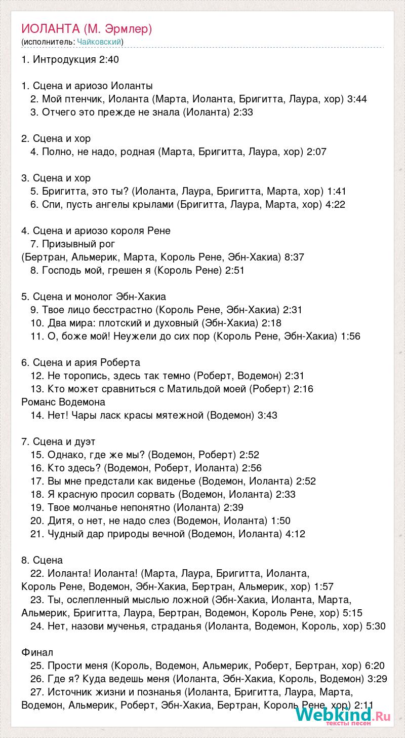 1. Интродукция 2:40 1. Сцена и ариозо Иоланты 2. Мой птенчик, Иоланта (Марта, Иоланта, Бригитта, Лаура, хор) 3:44 3. Отчего это прежде не знала (Иоланта) 2:33 2. Сцена и хор 4. Полно, не надо, родная (Марта, Бригитта, Лаура, хор) 2:07 3. Сцена и хор 5. Бригитта, это ты? (Иоланта, Лаура, Бригитта, Марта, хор) 1:41 6. Спи, пусть ангелы крылами (Бригитта, Лаура, Марта, хор) 4:22 4. Сцена и ариозо короля Рене 7. Призывный рог (Бертран, Альмерик, Марта, Король Рене, Эбн-Хакиа) 8:37 8. Господь мой, грешен я (Король Рене) 2:51 5. Сцена и монолог Эбн-Хакиа 9. Твое лицо бесстрастно (Король Рене, Эбн-Хакиа) 2:31 10. Два мира: плотский и духовный (Эбн-Хакиа) 2:18 11. О, боже мой! Неужели до сих пор (Король Рене, Эбн-Хакиа) 1:56 6. Сцена и ария Роберта 12. Не торопись, здесь так темно (Роберт, Водемон) 2:31 13. Кто может сравниться с Матильдой моей (Роберт) 2:16 Романс Водемона 14. Нет! Чары ласк красы мятежной (Водемон) 3:43 7. Сцена и дуэт 15. Однако, где же мы? (Водемон, Роберт) 2:52 16. Кто здесь? (Водемон, Роберт, Иоланта) 2:56 17. Вы мне предстали как виденье (Водемон, Иоланта) 2:52 18. Я красную просил сорвать (Водемон, Иоланта) 2:33 19. Твое молчанье непонятно (Иоланта) 2:39 20. Дитя, о нет, не надо слез (Водемон, Иоланта) 1:50 21. Чудный дар природы вечной (Водемон, Иоланта) 4:12 8. Сцена 22. Иоланта! Иоланта! (Марта, Лаура, Бригитта, Иоланта, Король Рене, Водемон, Эбн-Хакиа, Бертран, Альмерик, хор) 1:57 23. Ты, ослепленный мыслью ложной (Эбн-Хакиа, Иоланта, Марта, Альмерик, Бригитта, Лаура, Бертран, Водемон, Король Рене, хор) 5:15 24. Нет, назови мученья, страданья (Иоланта, Водемон, Король, хор) 5:30 Финал 25. Прости меня (Король, Водемон, Альмерик, Роберт, Бертран, хор) 6:20 26. Где я? Куда ведешь меня (Иоланта, Эбн-Хакиа, Король, Водемон) 3:29 27. Источник жизни и познанья (Иоланта, Бригитта, Лаура, Марта, Водемон, Альмерик, Роберт, Эбн-Хакиа, Бертран, Король Рене, хор) 2:11