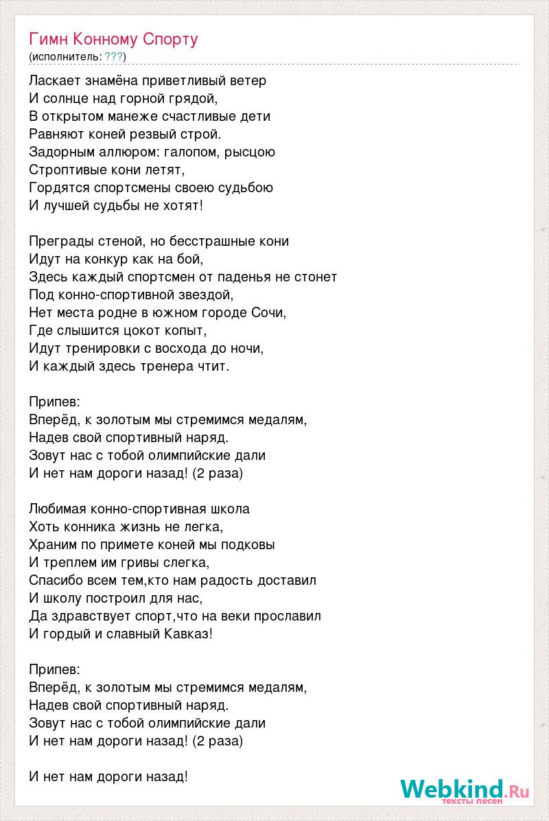 Ласкает знамёна приветливый ветер И солнце над горной грядой, В открытом манеже счастливые дети Равняют коней резвый строй. Задорным аллюром: галопом, рысцою Строптивые кони летят, Гордятся спортсмены своею судьбою И лучшей судьбы не хотят! Преграды стеной, но бесстрашные кони Идут на конкур как на бой, Здесь каждый спортсмен от паденья не стонет Под конно-спортивной звездой, Нет места родне в южном городе Сочи, Где слышится цокот копыт, Идут тренировки с восхода до ночи, И каждый здесь тренера чтит. Припев: Вперёд, к золотым мы стремимся медалям, Надев свой спортивный наряд. Зовут нас с тобой олимпийские дали И нет нам дороги назад! (2 раза) Любимая конно-спортивная школа Хоть конника жизнь не легка, Храним по примете коней мы подковы И треплем им гривы слегка, Спасибо всем тем,кто нам радость доставил И школу построил для нас, Да здравствует спорт,что на веки прославил И гордый и славный Кавказ! Припев: Вперёд, к золотым мы стремимся медалям, Надев свой спортивный наряд. Зовут нас с тобой олимпийские дали И нет нам дороги назад! (2 раза) И нет нам дороги назад!