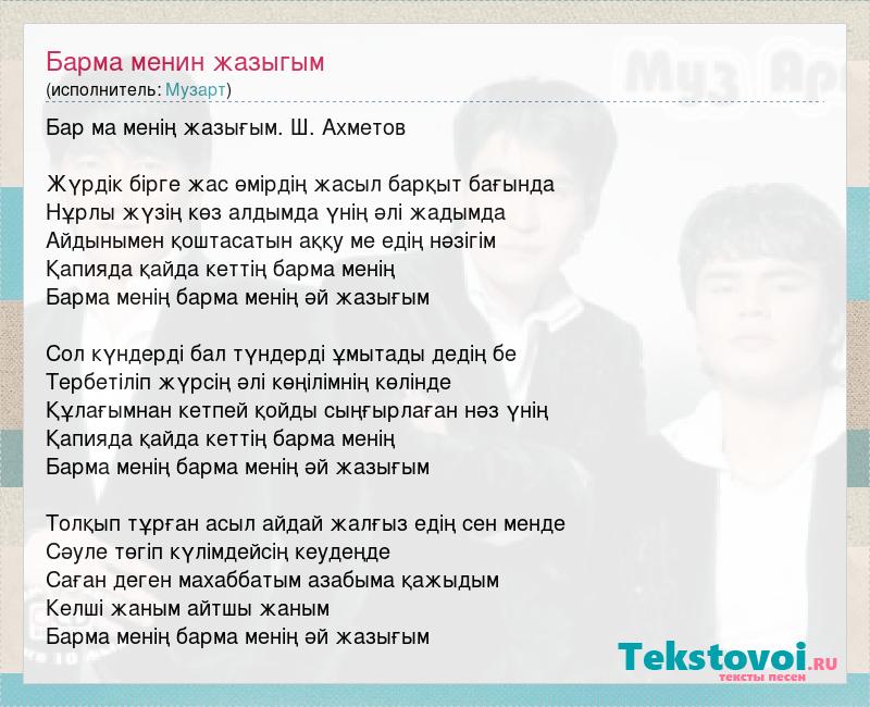 Бар ма менің жазығым. Ш. Ахметов Жүрдік бірге жас өмірдің жасыл барқыт бағында Нұрлы жүзің көз алдымда үнің әлі жадымда Айдынымен қоштасатын аққу ме едің нәзігім Қапияда қайда кеттің барма менің Барма менің барма менің әй жазығым Сол күндерді бал түндерді ұмытады дедің бе Тербетіліп жүрсің әлі көңілімнің көлінде Құлағымнан кетпей қойды сыңғырлаған нәз үнің Қапияда қайда кеттің барма менің Барма менің барма менің әй жазығым Толқып тұрған асыл айдай жалғыз едің сен менде Сәуле төгіп күлімдейсің кеудеңде Саған деген махаббатым азабыма қажыдым Келші жаным айтшы жаным Барма менің барма менің әй жазығым