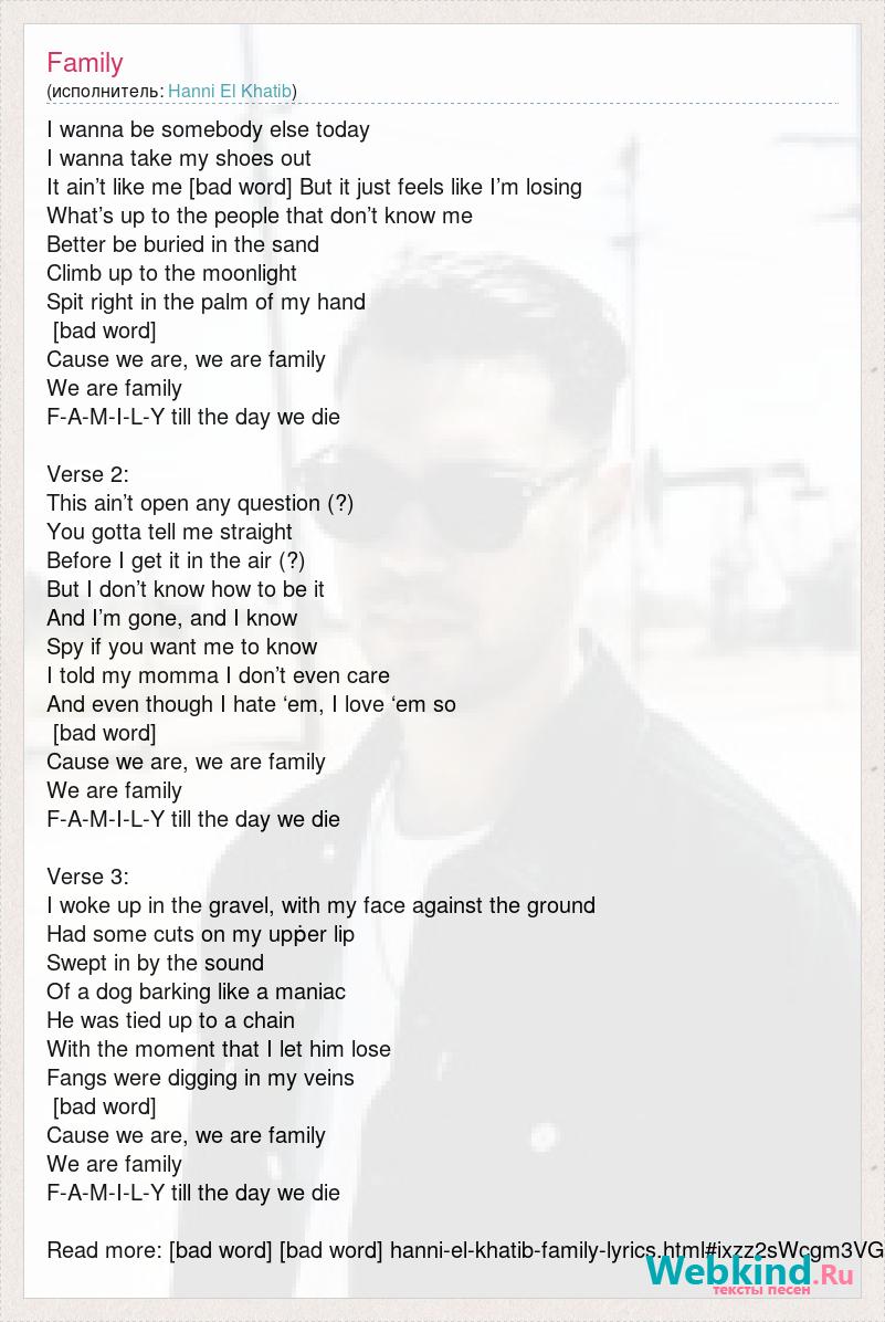 I wanna be somebody else today I wanna take my shoes out It ain’t like me [bad word] But it just feels like I’m losing What’s up to the people that don’t know me Better be buried in the sand Climb up to the moonlight Spit right in the palm of my hand [bad word] Cause we are, we are family We are family F-A-M-I-L-Y till the day we die Verse 2: This ain’t open any question (?) You gotta tell me straight Before I get it in the air (?) But I don’t know how to be it And I’m gone, and I know Spy if you want me to know I told my momma I don’t even care And even though I hate ‘em, I love ‘em so [bad word] Cause we are, we are family We are family F-A-M-I-L-Y till the day we die Verse 3: I woke up in the gravel, with my face against the ground Had some cuts on my upṗer lip Swept in by the sound Of a dog barking like a maniac He was tied up to a chain With the moment that I let him lose Fangs were digging in my veins [bad word] Cause we are, we are family We are family F-A-M-I-L-Y till the day we die Read more: [bad word] [bad word] hanni-el-khatib-family-lyrics.html#ixzz2sWcgm3VG