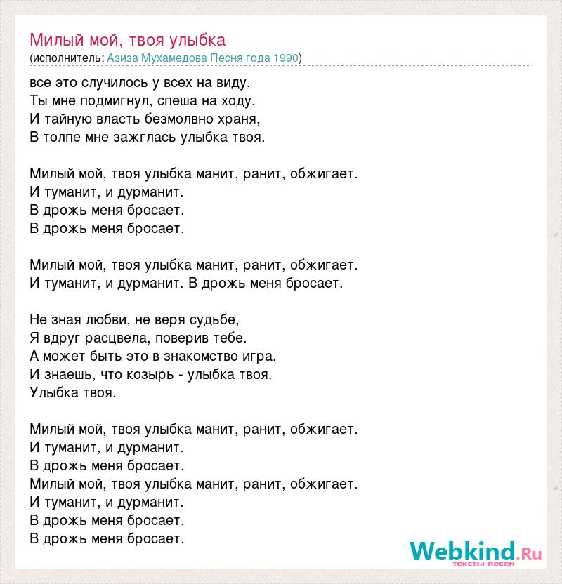все это случилось у всех на виду. Ты мне подмигнул, спеша на ходу. И тайную власть безмолвно храня, В толпе мне зажглась улыбка твоя. Милый мой, твоя улыбка манит, ранит, обжигает. И туманит, и дурманит. В дрожь меня бросает. В дрожь меня бросает. Милый мой, твоя улыбка манит, ранит, обжигает. И туманит, и дурманит. В дрожь меня бросает. Не зная любви, не веря судьбе, Я вдруг расцвела, поверив тебе. А может быть это в знакомство игра. И знаешь, что козырь - улыбка твоя. Улыбка твоя. Милый мой, твоя улыбка манит, ранит, обжигает. И туманит, и дурманит. В дрожь меня бросает. Милый мой, твоя улыбка манит, ранит, обжигает. И туманит, и дурманит. В дрожь меня бросает. В дрожь меня бросает.
