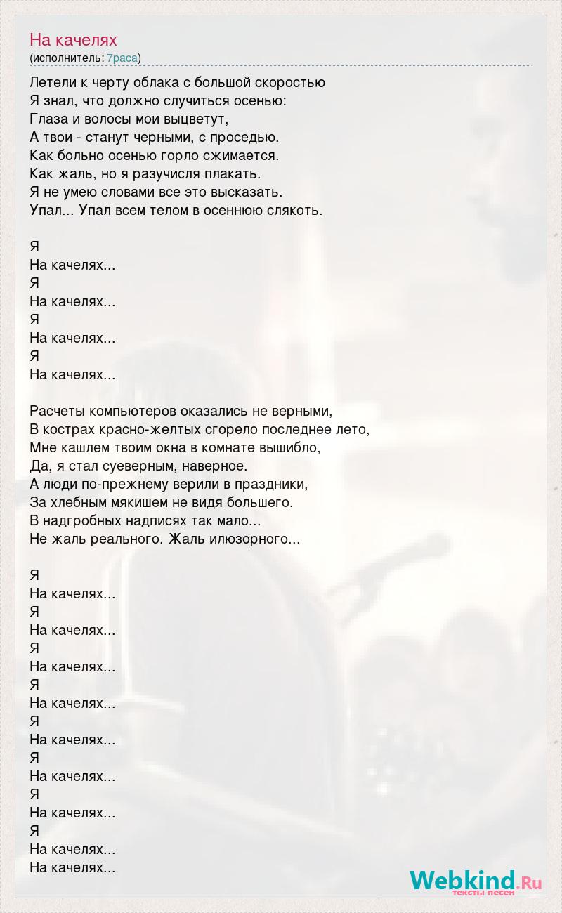 Летели к черту облака с большой скоростью Я знал, что должно случиться осенью: Глаза и волосы мои выцветут, А твои - станут черными, с проседью. Как больно осенью горло сжимается. Как жаль, но я разучисля плакать. Я не умею словами все это высказать. Упал... Упал всем телом в осеннюю слякоть. Я На качелях... Я На качелях... Я На качелях... Я На качелях... Расчеты компьютеров оказались не верными, В кострах красно-желтых сгорело последнее лето, Мне кашлем твоим окна в комнате вышибло, Да, я стал суеверным, наверное. А люди по-прежнему верили в праздники, За хлебным мякишем не видя большего. В надгробных надписях так мало... Не жаль реального. Жаль илюзорного... Я На качелях... Я На качелях... Я На качелях... Я На качелях... Я На качелях... Я На качелях... Я На качелях... Я На качелях... На качелях...