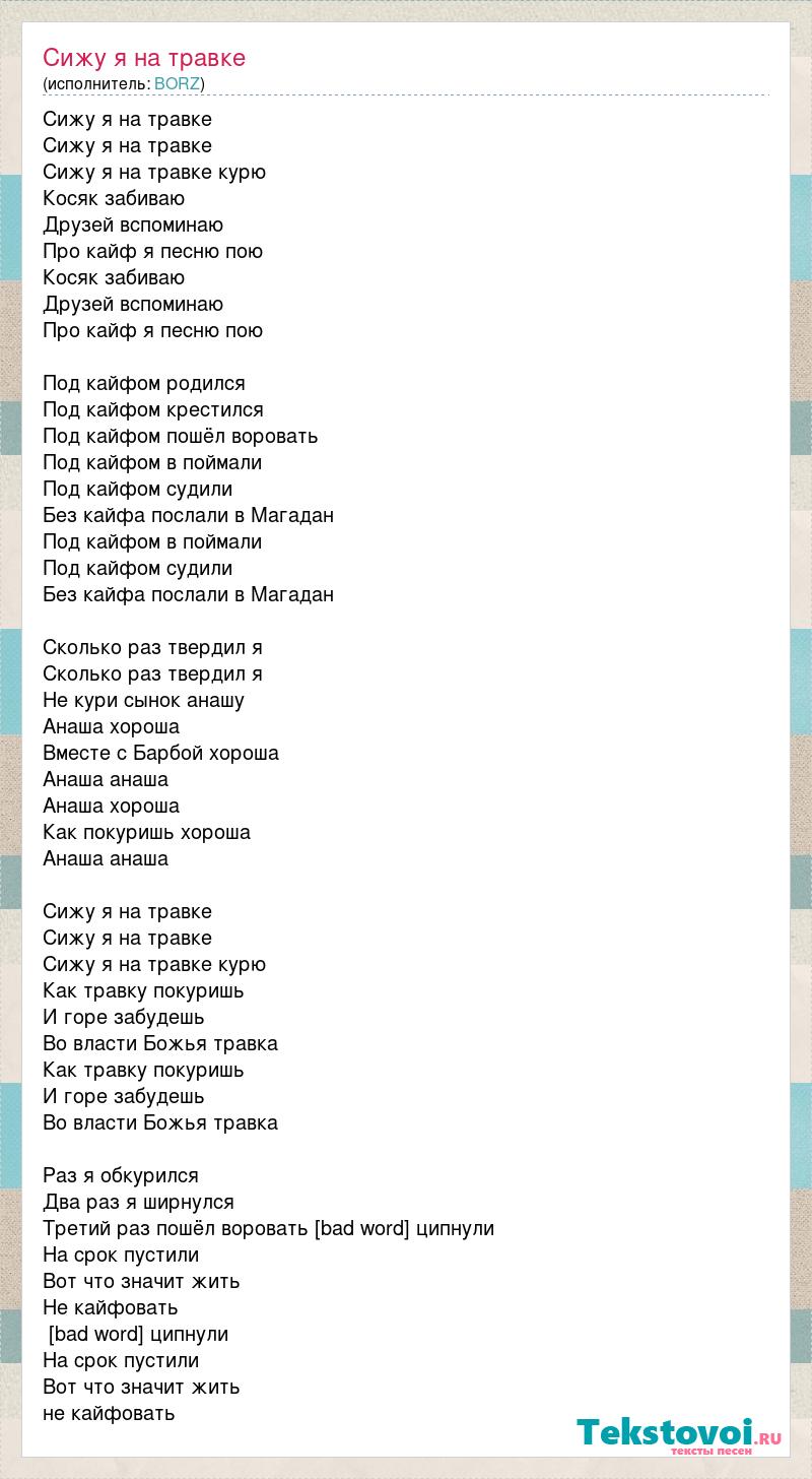Сижу я на травке Сижу я на травке Сижу я на травке курю Косяк забиваю Друзей вспоминаю Про кайф я песню пою Косяк забиваю Друзей вспоминаю Про кайф я песню пою Под кайфом родился Под кайфом крестился Под кайфом пошёл воровать Под кайфом в поймали Под кайфом судили Без кайфа послали в Магадан Под кайфом в поймали Под кайфом судили Без кайфа послали в Магадан Сколько раз твердил я Сколько раз твердил я Не кури сынок анашу Анаша хороша Вместе с Барбой хороша Анаша анаша Анаша хороша Как покуришь хороша Анаша анаша Сижу я на травке Сижу я на травке Сижу я на травке курю Как травку покуришь И горе забудешь Во власти Божья травка Как травку покуришь И горе забудешь Во власти Божья травка Раз я обкурился Два раз я ширнулся Третий раз пошёл воровать [bad word] ципнули На срок пустили Вот что значит жить Не кайфовать [bad word] ципнули На срок пустили Вот что значит жить не кайфовать