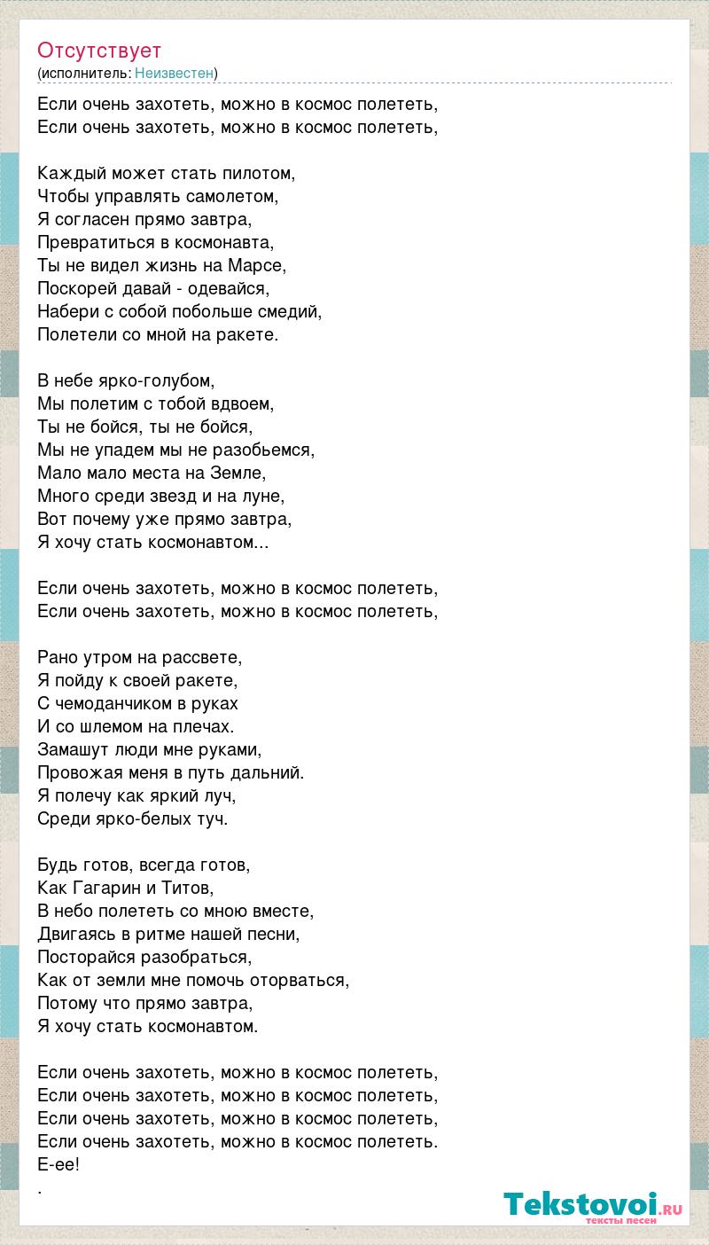 Если очень захотеть, можно в космос полететь, Если очень захотеть, можно в космос полететь, Каждый может стать пилотом, Чтобы управлять самолетом, Я согласен прямо завтра, Превратиться в космонавта, Ты не видел жизнь на Марсе, Поскорей давай - одевайся, Набери с собой побольше смедий, Полетели со мной на ракете. В небе ярко-голубом, Мы полетим с тобой вдвоем, Ты не бойся, ты не бойся, Мы не упадем мы не разобьемся, Мало мало места на Земле, Много среди звезд и на луне, Вот почему уже прямо завтра, Я хочу стать космонавтом... Если очень захотеть, можно в космос полететь, Если очень захотеть, можно в космос полететь, Рано утром на рассвете, Я пойду к своей ракете, С чемоданчиком в руках И со шлемом на плечах. Замашут люди мне руками, Провожая меня в путь дальний. Я полечу как яркий луч, Среди ярко-белых туч. Будь готов, всегда готов, Как Гагарин и Титов, В небо полететь со мною вместе, Двигаясь в ритме нашей песни, Посторайся разобраться, Как от земли мне помочь оторваться, Потому что прямо завтра, Я хочу стать космонавтом. Если очень захотеть, можно в космос полететь, Если очень захотеть, можно в космос полететь, Если очень захотеть, можно в космос полететь, Если очень захотеть, можно в космос полететь. Е-ее! .