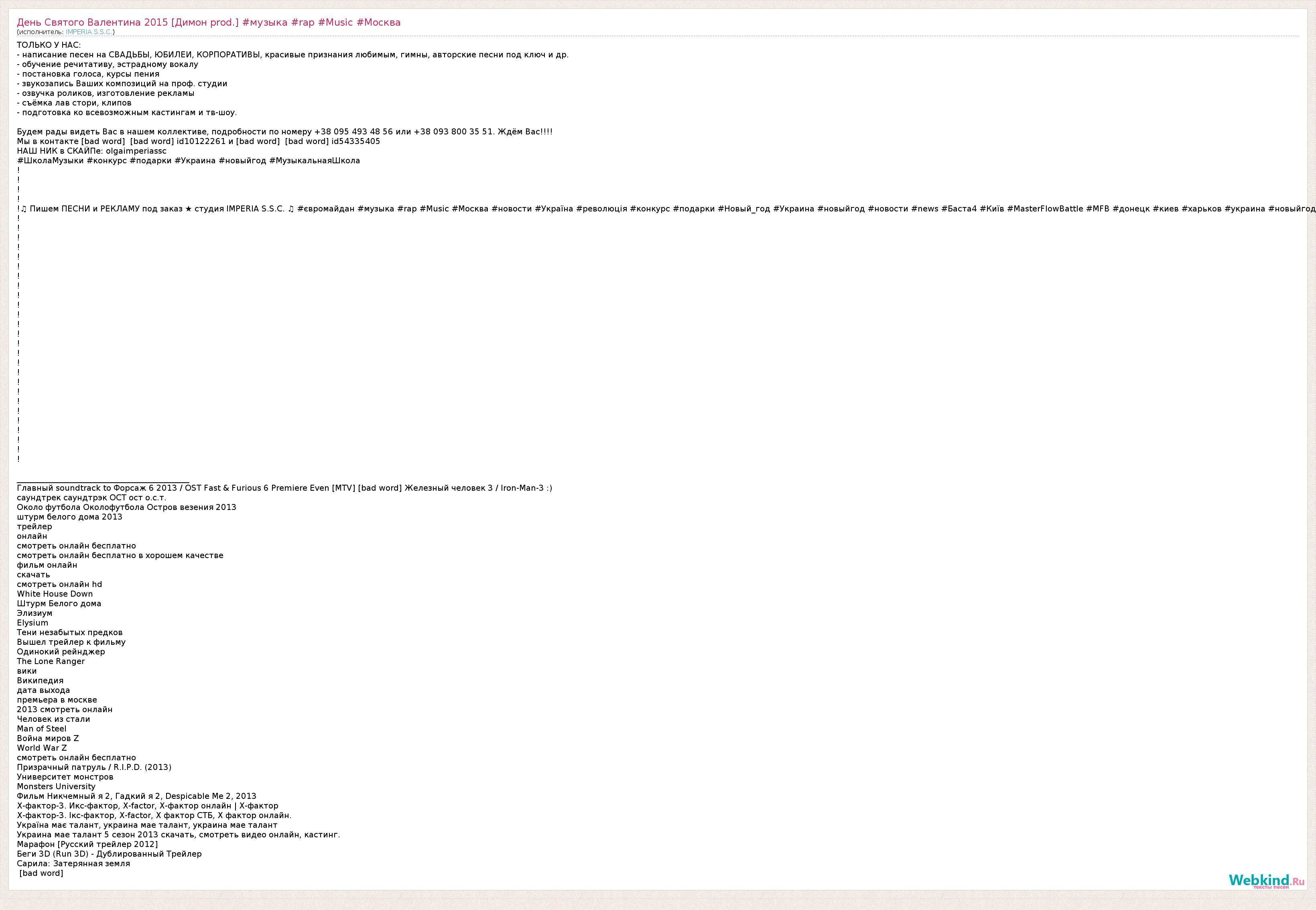 ТОЛЬКО У НАС: - написание песен на СВАДЬБЫ, ЮБИЛЕИ, КОРПОРАТИВЫ, красивые признания любимым, гимны, авторские песни под ключ и др. - обучение речитативу, эстрадному вокалу - постановка голоса, курсы пения - звукозапись Ваших композиций на проф. студии - озвучка роликов, изготовление рекламы - съёмка лав стори, клипов - подготовка ко всевозможным кастингам и тв-шоу. Будем рады видеть Вас в нашем коллективе, подробности по номеру +38 095 493 48 56 или +38 093 800 35 51. Ждём Вас!!!! Мы в контакте [bad word] [bad word] id10122261 и [bad word] [bad word] id54335405 НАШ НИК в СКАЙПе: olgaimperiassc #ШколаМузыки #конкурс #подарки #Украина #новыйгод #МузыкальнаяШкола ! ! ! ! !♫ Пишем ПЕСНИ и РЕКЛАМУ под заказ ★ студия IMPERIA S.S.C. ♫ #євромайдан #музыка #rap #Music #Москва #новости #Україна #революція #конкурс #подарки #Новый_год #Украина #новыйгод #новости #news #Баста4 #Київ #MasterFlowBattle #MFB #донецк #киев #харьков #украина #новыйгод ! ! ! ! ! ! ! ! ! ! ! ! ! ! ! ! ! ! ! ! ! ! ! ! ! ! ___________________________________________ Главный soundtrack to Форсаж 6 2013 / OST Fast & Furious 6 Premiere Even [MTV] [bad word] Железный человек 3 / Iron-Man-3 :) саундтрек саундтрэк ОСТ ост о.с.т. Около футбола Околофутбола Остров везения 2013 штурм белого дома 2013 трейлер онлайн смотреть онлайн бесплатно смотреть онлайн бесплатно в хорошем качестве фильм онлайн скачать смотреть онлайн hd White House Down Штурм Белого дома Элизиум Elysium Тени незабытых предков Вышел трейлер к фильму Одинокий рейнджер The Lone Ranger вики Википедия дата выхода премьера в москве 2013 смотреть онлайн Человек из стали Man of Steel Война миров Z World War Z смотреть онлайн бесплатно Призрачный патруль / R.I.P.D. (2013) Университет монстров Monsters University Фильм Никчемный я 2, Гадкий я 2, Despicable Me 2, 2013 Х-фактор-3. Икс-фактор, X-factor, Х-фактор онлайн | Х-фактор Х-фактор-3. Ікс-фактор, X-factor, Х фактор СТБ, Х фактор онлайн. Україна має талант, украина мае талант, украина мае талант Украина мае талант 5 сезон 2013 скачать, смотреть видео онлайн, кастинг. Марафон [Русский трейлер 2012] Беги 3D (Run 3D) - Дублированный Трейлер Сарила: Затерянная земля [bad word]