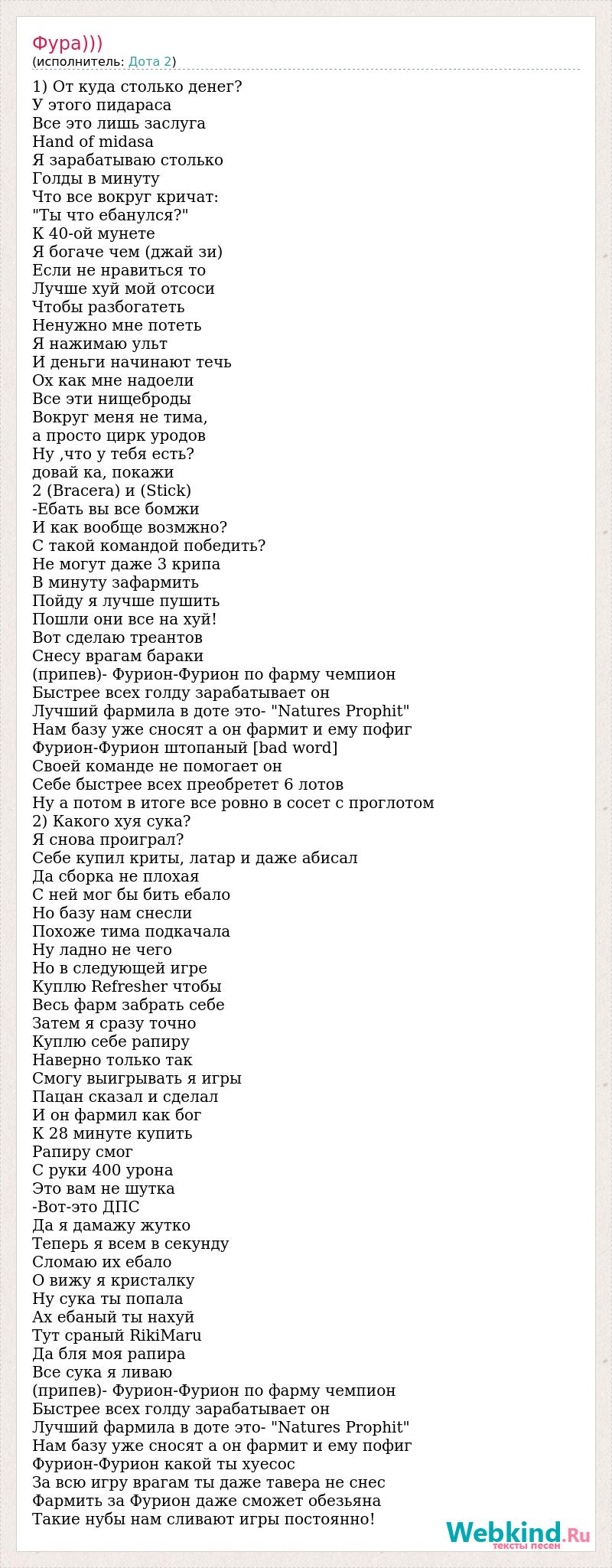 1) От куда столько денег? У этого пидараса Все это лишь заслуга Hand of midasa Я зарабатываю столько Голды в минуту Что все вокруг кричат: "Ты что ебанулся?" К 40-ой мунете Я богаче чем (джай зи) Если не нравиться то Лучше хуй мой отсоси Чтобы разбогатеть Ненужно мне потеть Я нажимаю ульт И деньги начинают течь Ох как мне надоели Все эти нищеброды Вокруг меня не тима, а просто цирк уродов Ну ,что у тебя есть? довай ка, покажи 2 (Bracera) и (Stick) -Ебать вы все бомжи И как вообще возмжно? С такой командой победить? Не могут даже 3 крипа В минуту зафармить Пойду я лучше пушить Пошли они все на хуй! Вот сделаю треантов Снесу врагам бараки (припев)- Фурион-Фурион по фарму чемпион Быстрее всех голду зарабатывает он Лучший фармила в доте это- "Natures Prophit" Нам базу уже сносят а он фармит и ему пофиг Фурион-Фурион штопаный [bad word] Своей команде не помогает он Себе быстрее всех преобретет 6 лотов Ну а потом в итоге все ровно в сосет с проглотом 2) Какого хуя сука? Я снова проиграл? Себе купил криты, латар и даже абисал Да сборка не плохая С ней мог бы бить ебало Но базу нам снесли Похоже тима подкачала Ну ладно не чего Но в следующей игре Куплю Refresher чтобы Весь фарм забрать себе Затем я сразу точно Куплю себе рапиру Наверно только так Смогу выигрывать я игры Пацан сказал и сделал И он фармил как бог К 28 минуте купить Рапиру смог С руки 400 урона Это вам не шутка -Вот-это ДПС Да я дамажу жутко Теперь я всем в секунду Сломаю их ебало О вижу я кристалку Ну сука ты попала Ах ебаный ты нахуй Тут сраный RikiMaru Да бля моя рапира Все сука я ливаю (припев)- Фурион-Фурион по фарму чемпион Быстрее всех голду зарабатывает он Лучший фармила в доте это- "Natures Prophit" Нам базу уже сносят а он фармит и ему пофиг Фурион-Фурион какой ты хуесос За всю игру врагам ты даже тавера не снес Фармить за Фурион даже сможет обезьяна Такие нубы нам сливают игры постоянно!