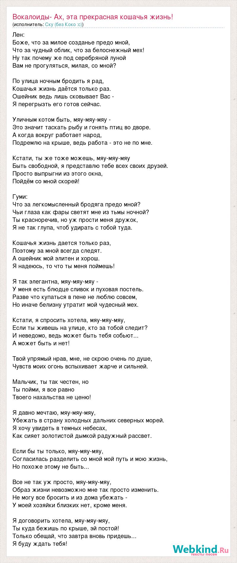 Лен: Боже, что за милое созданье предо мной, Что за чудный облик, что за белоснежный мех! Ну так почему же под серебряной луной Вам не прогуляться, милая, со мной? По улица ночным бродить я рад, Кошачья жизнь даётся только раз. Ошейник ведь лишь сковывает Вас - Я перегрызть его готов сейчас. Уличным котом быть, мяу-мяу-мяу - Это значит таскать рыбу и гонять птиц во дворе. А когда вокруг работает народ, Подремлю на крыше, ведь работа - это не по мне. Кстати, ты же тоже можешь, мяу-мяу-мяу Быть свободной, я представлю тебе всех своих друзей. Просто выпрыгни из этого окна, Пойдём со мной скорей! Гуми: Что за легкомысленный бродяга предо мной? Чьи глаза как фары светят мне из тьмы ночной? Ты красноречив, но уж прости меня дружок, Я не так глупа, чтоб удирать с тобой туда. Кошачья жизнь дается только раз, Поэтому за мной всегда следят. А ошейник мой элитен и хорош. Я надеюсь, то что ты меня поймешь! Я так элегантна, мяу-мяу-мяу - У меня есть блюдце сливок и пуховая постель. Разве что купаться в пене не люблю совсем, Но иначе белизну утратит мой чудесный мех. Кстати, я спросить хотела, мяу-мяу-мяу, Если ты живешь на улице, кто за тобой следит? И неведомо, ведь может быть тебя собьют... А может быть и нет! Твой упрямый нрав, мне, не скрою очень по душе, Чувств моих огонь вспыхивает жарче и сильней. Мальчик, ты так честен, но Ты пойми, я все равно Твоего нахальства не ценю! Я давно мечтаю, мяу-мяу-мяу, Убежать в страну холодных дальних северных морей. Я хочу увидеть в темных небесах, Как сияет золотистой дымкой радужный рассвет. Если бы ты только, мяу-мяу-мяу, Согласилась разделить со мной мой путь и мою жизнь, Но похоже этому не быть... Все не так уж просто, мяу-мяу-мяу, Образ жизни невозможно мне так просто изменить. Не могу все бросить и из дома убежать - У моей хозяйки близких нет, кроме меня. Я договорить хотела, мяу-мяу-мяу, Ты куда бежишь по крыше, эй постой! Только обещай, что завтра вновь придешь... Я буду ждать тебя!