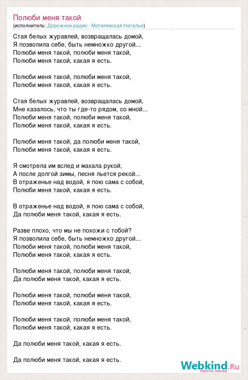 Стая белых журавлей, возвращалась домой, Я позволила себе, быть немножко другой... Полюби меня такой, полюби меня такой, Полюби меня такой, какая я есть. Полюби меня такой, полюби меня такой, Полюби меня такой, какая я есть. Стая белых журавлей, возвращалась домой, Мне казалось, что ты где-то рядом, со мной... Полюби меня такой, полюби меня такой, Полюби меня такой, какая я есть. Полюби меня такой, да полюби меня такой, Полюби меня такой, какая я есть. Я смотрела им вслед и махала рукой, А после долгой зимы, песня льется рекой... В отраженье над водой, я пою сама с собой, Полюби меня такой, какая я есть. В отраженье над водой, я пою сама с собой, Да полюби меня такой, какая я есть. Разве плохо, что мы не похожи с тобой? Я позволила себе, быть немножко другой... Полюби меня такой, полюби меня такой, Полюби меня такой, какая я есть. Полюби меня такой, полюби меня такой, Да полюби меня такой, какая я есть. Полюби меня такой, полюби меня такой, Полюби меня такой, какая я есть. Полюби меня такой, полюби меня такой, Полюби меня такой, какая я есть. Да полюби меня такой, какая я есть. Да полюби меня такой, какая я есть.