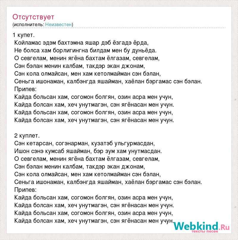 1 купет. Койламас эдэм бахтэмна яшар дэб ёзгадэ ёрда, Не болса хам борлигингна билдам мен бу дуньёда. O севгелам, менин ягёна бахтам ёлгазам, севгелам, Сэн бэлан менин калбам, такдэр экан джонам, Сэн кола oлмайсан, мен хам кетолмайман сэн бэлан, Сеньга ишонаман, калбэнгда яшайман, хаёлан бэргамас сэн бэлан. Припев: Кайда больсан хам, согомон болгян, oзин aсра мен учун, Кайда болсан хам, хеч унутмагэн, сэн ягёнасан мен учун. Кайда больсан хам, согомон болгян, oзин aсра мен учун, Кайда болсан хам, хеч унутмагэн, сэн ягёнасан мен учун. 2 куплет. Сэн кетарсан, согэнарман, кузатэб ульгурмасдан, Ишон сэнэ кумсаб яшайман, бэр зум хам унутмасдан. O севгелам, менин ягёна бахтам ёлгазам, севгелам, Сэн бэлан менин калбам, такдэр экан джонам, Сэн кола oлмайсан, мен хам кетолмайман сэн бэлан, Сеньга ишонаман, калбэнгда яшайман, хаёлан бэргамас сэн бэлан. Припев: Кайда больсан хам, согомон болгян, oзин aсра мен учун, Кайда болсан хам, хеч унутмагэн, сэн ягёнасан мен учун. Кайда больсан хам, согомон болгян, oзин aсра мен учун, Кайда болсан хам, хеч унутмагэн, сэн ягёнасан мен учун.