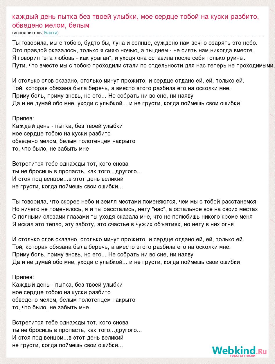 Ты говорила, мы с тобою, будто бы, луна и солнце, суждено нам вечно озарять это небо. Это правдой оказалось, только я сияю ночью, а ты днем - не сиять нам никогда вместе. Я говорил "эта любовь - как ураган", и уходя она оставила после себя только руины. Пути, что вместе мы с тобою проходили стали по отдельности для нас теперь не проходимыми, И столько слов сказано, столько минут прожито, и сердце отдано ей, ей, только ей. Той, которая обязана была беречь, а вместо этого разбила его на осколки мне. Приму боль, приму вновь, но его... Не собрать ни во сне, ни наяву Да и не думай обо мне, уходи с улыбкой... и не грусти, когда поймешь свои ошибки Припев: Каждый день - пытка, без твоей улыбки мое сердце тобою на куски разбито обведено мелом, белым полотенцем накрыто то, что было, не забыть мне Встретится тебе однажды тот, кого снова ты не бросишь в пропасть, как того...другого... И стоя под венцом...в этот день великий не грусти, когда поймешь свои ошибки... Ты говорила, что скорее небо и земля местами поменяются, чем мы с тобой расстанемся Но ничего не поменялось, я и ты расстались, нету "нас", а остальное все на своих местах С полными слезами глазами ты уходя сказала мне, что не полюбишь никого кроме меня Я искал это тепло, эту заботу, это счастье в чужих объятиях, но нету в них огня И столько слов сказано, столько минут прожито, и сердце отдано ей, ей, только ей. Той, которая обязана была беречь, а вместо этого разбила его на осколки мне. Приму боль, приму вновь, но его... Не собрать ни во сне, ни наяву Да и не думай обо мне, уходи с улыбкой... и не грусти, когда поймешь свои ошибки Припев: Каждый день - пытка, без твоей улыбки мое сердце тобою на куски разбито обведено мелом, белым полотенцем накрыто то, что было, не забыть мне Встретится тебе однажды тот, кого снова ты не бросишь в пропасть, как того...другого... И стоя под венцом...в этот день великий не грусти, когда поймешь свои ошибки...