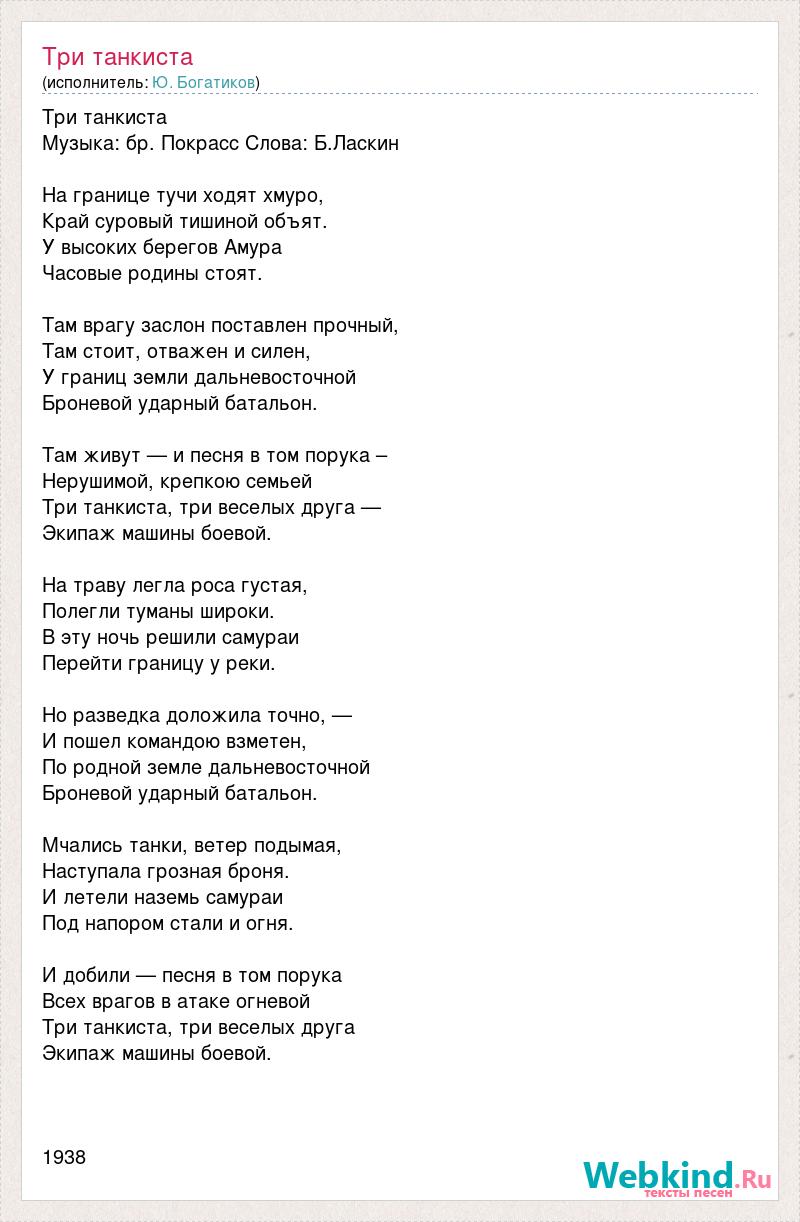 Три танкиста Музыка: бр. Покрасс Слова: Б.Ласкин На границе тучи ходят хмуро, Край суровый тишиной объят. У высоких берегов Амура Часовые родины стоят. Там врагу заслон поставлен прочный, Там стоит, отважен и силен, У границ земли дальневосточной Броневой ударный батальон. Там живут — и песня в том порука – Нерушимой, крепкою семьей Три танкиста, три веселых друга — Экипаж машины боевой. На траву легла роса густая, Полегли туманы широки. В эту ночь решили самураи Перейти границу у реки. Но разведка доложила точно, — И пошел командою взметен, По родной земле дальневосточной Броневой ударный батальон. Мчались танки, ветер подымая, Наступала грозная броня. И летели наземь самураи Под напором стали и огня. И добили — песня в том порука Всех врагов в атаке огневой Три танкиста, три веселых друга Экипаж машины боевой. 1938