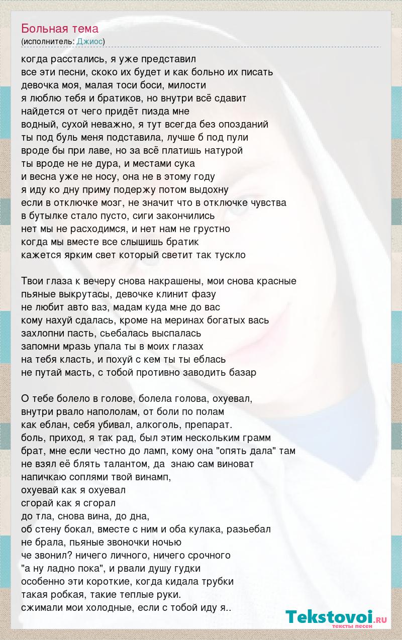 когда расстались, я уже представил все эти песни, скоко их будет и как больно их писать девочка моя, малая тоси боси, милости я люблю тебя и братиков, но внутри всё сдавит найдется от чего придёт пизда мне водный, сухой неважно, я тут всегда без опозданий ты под буль меня подставила, лучше б под пули вроде бы при лаве, но за всё платишь натурой ты вроде не не дура, и местами сука и весна уже не носу, она не в этому году я иду ко дну приму подержу потом выдохну если в отключке мозг, не значит что в отключке чувства в бутылке стало пусто, сиги закончились нет мы не расходимся, и нет нам не грустно когда мы вместе все слышишь братик кажется ярким свет который светит так тускло Твои глаза к вечеру снова накрашены, мои снова красные пьяные выкрутасы, девочке клинит фазу не любит авто ваз, мадам куда мне до вас кому нахуй сдалась, кроме на меринах богатых вась захлопни пасть, сьебалась выспалась запомни мразь упала ты в моих глазах на тебя класть, и похуй с кем ты ты еблась не путай масть, с тобой противно заводить базар О тебе болело в голове, болела голова, охуевал, внутри рвало напололам, от боли по полам как еблан, себя убивал, алкоголь, препарат. боль, приход, я так рад, был этим нескольким грамм брат, мне если честно до ламп, кому она "опять дала" там не взял её блять талантом, да знаю сам виноват напичкаю соплями твой винамп, охуевай как я охуевал сгорай как я сгорал до тла, снова вина, до дна, об стену бокал, вместе с ним и оба кулака, разьебал не брала, пьяные звоночки ночью че звонил? ничего личного, ничего срочного "а ну ладно пока", и рвали душу гудки особенно эти короткие, когда кидала трубки такая робкая, такие теплые руки. сжимали мои холодные, если с тобой иду я..